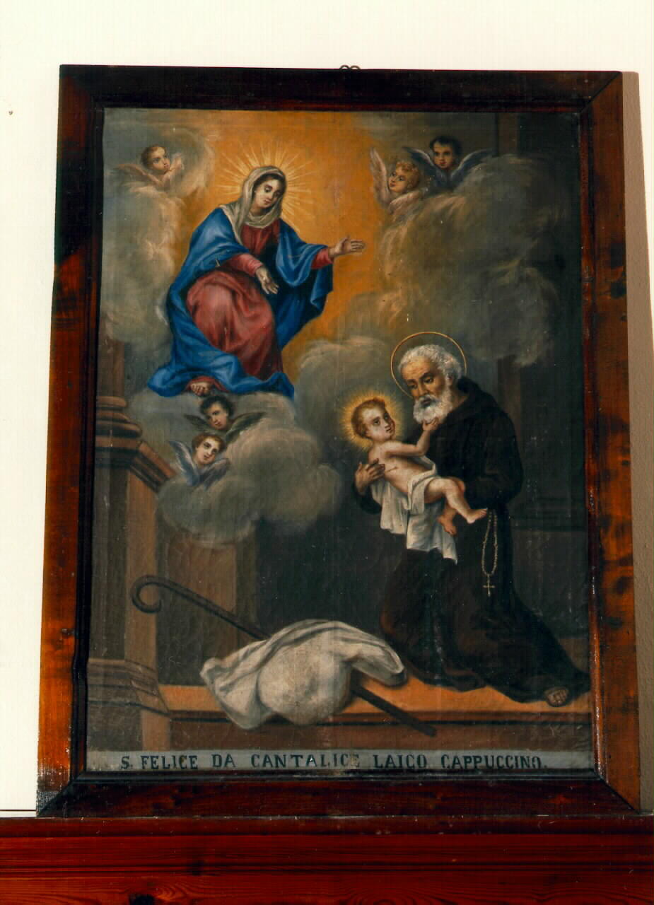 Personaggi: S. Felice da Cantalice; Madonna; Gesu' Bambino. Attributi: (S. Felice da Cantalice) sacca; bastone. Figure: cherubini. Elementi architettonici: colonne