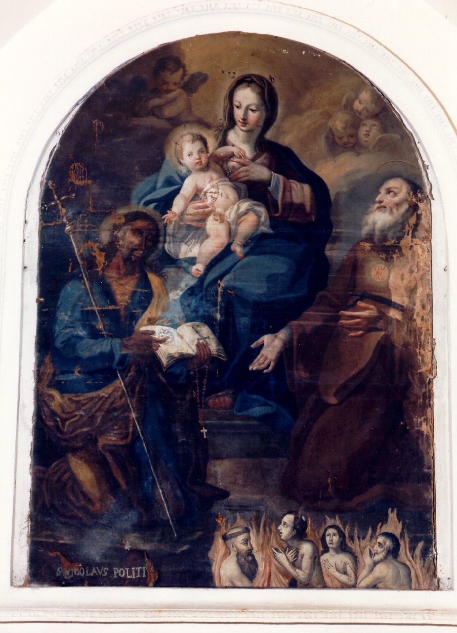 Personaggi: Madonna; Gesu' Bambino; S. Giovanni Battista; S. Nicola Politi. Figure: anime dei dannati; angeli; cherubini. Suppellettili ecclesiastiche: croce astile; rosario. Oggetti: libro