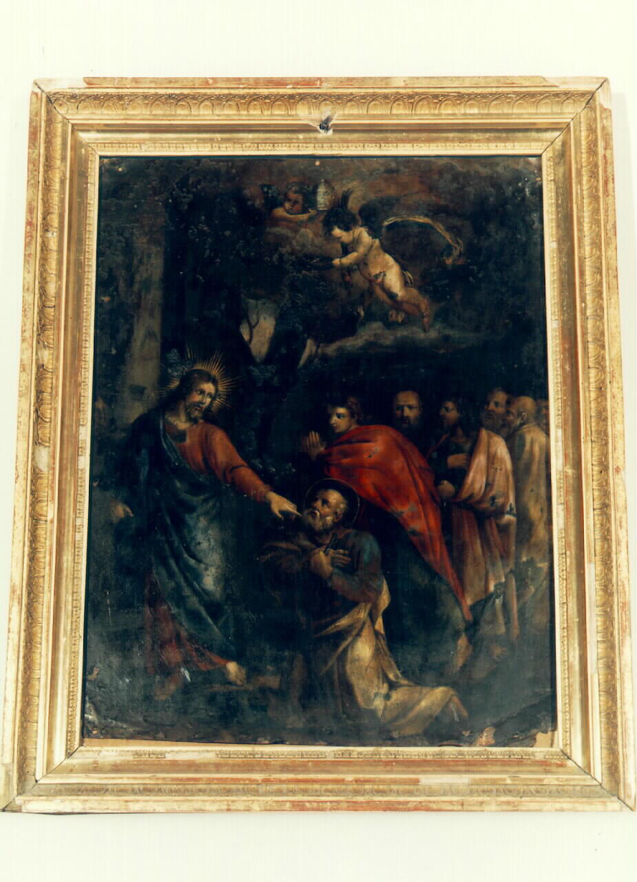 Personaggi: Cristo; S. Pietro apostolo; S. Giovanni. Figure: figure maschili; angioletti. Simboli: insegne ecclesiastiche; palma; corona d'alloro. Piante: albero