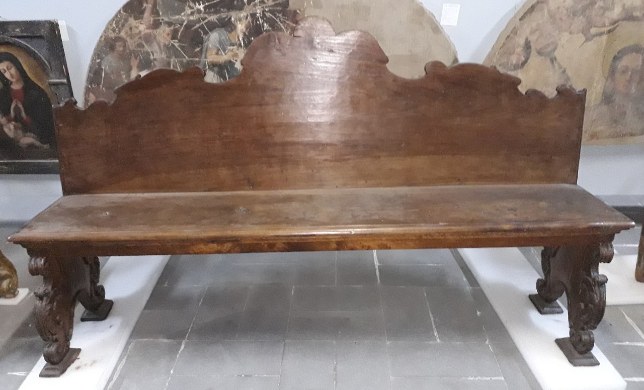 - NOTIZIE STORICO CRITICHE Entrata, insieme ad altre tre di uguale foggia, nelle collezioni del Museo dopo il terremoto del 1908, proveniente dal distrutto monastero di benedettine di S. Gregorio, la panca presenta caratteri stilistici barocchi quali volute, decorazioni fito-floreali, simmetria. Essa faceva parte, molto probabilmente, degli "otto stalli in noce, squisitamente, intagliati nelle spalle esterne" voluti dall'abadessa suor Antonia Maria Ruffo nel 1663 in occasione della costruzione del nuovo parlatorio del monastero (vedi bibliografia, Mazziotta)