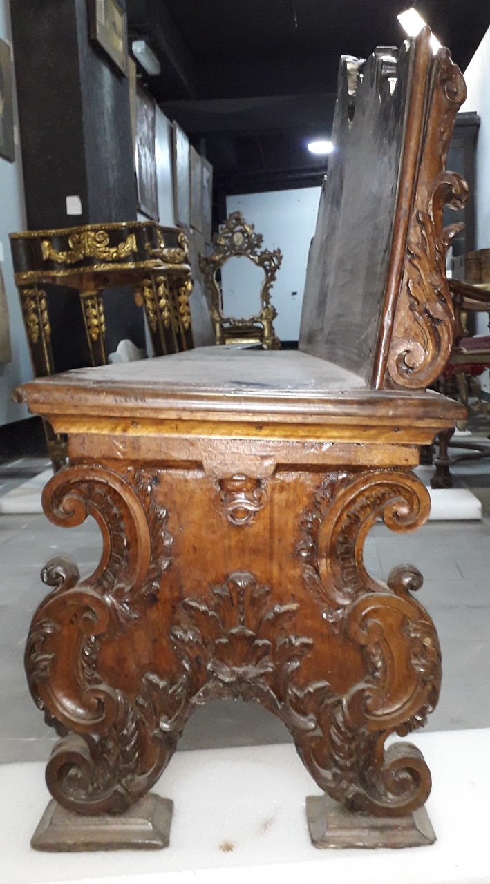 Panca di forma rettangolare con alto schienale intagliato sul retro. Gambe ad "asso di coppe" con volute intagliate. Seduta rettangolare con orlo modanato "a becco di civetta"