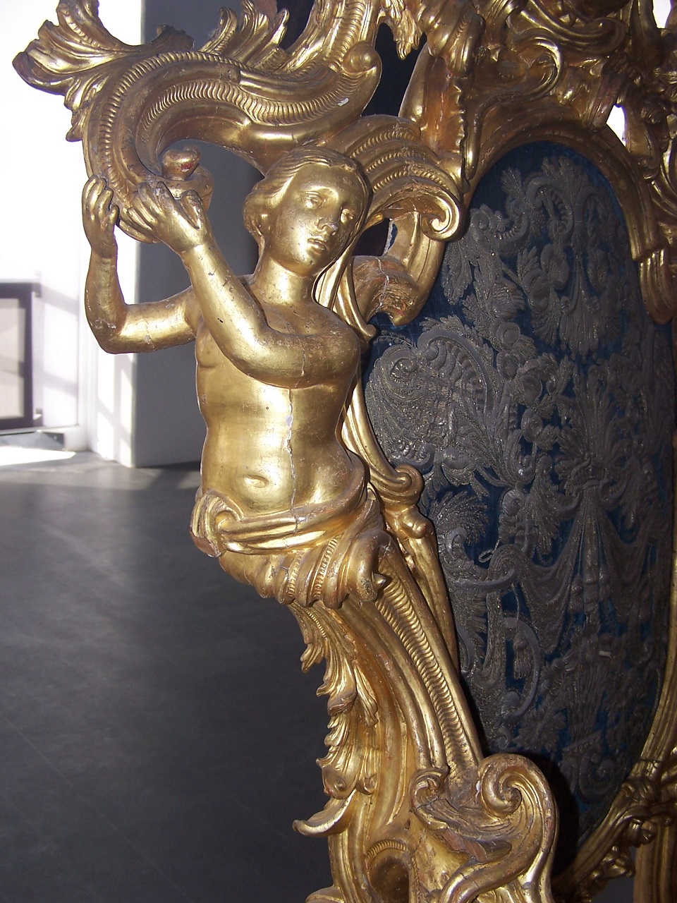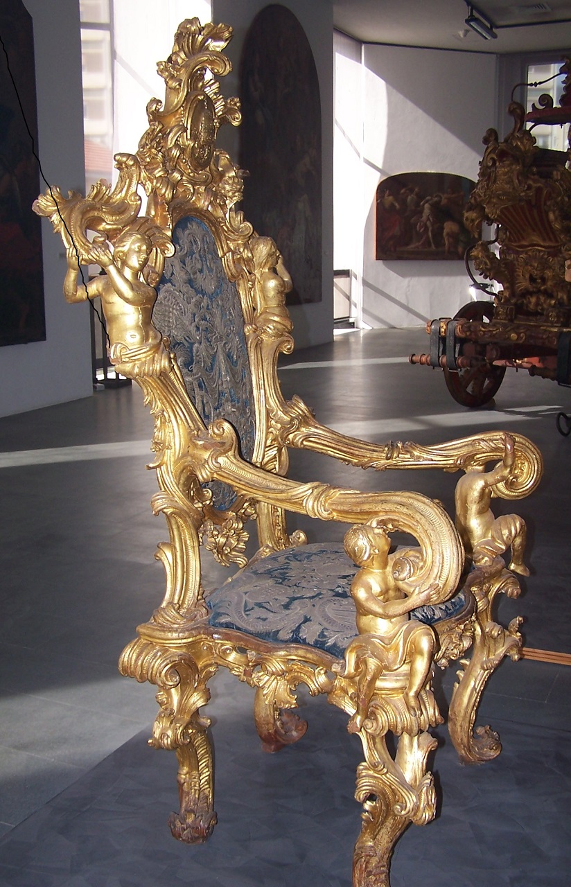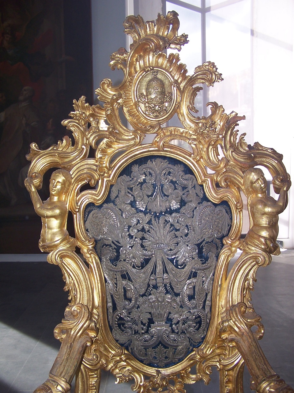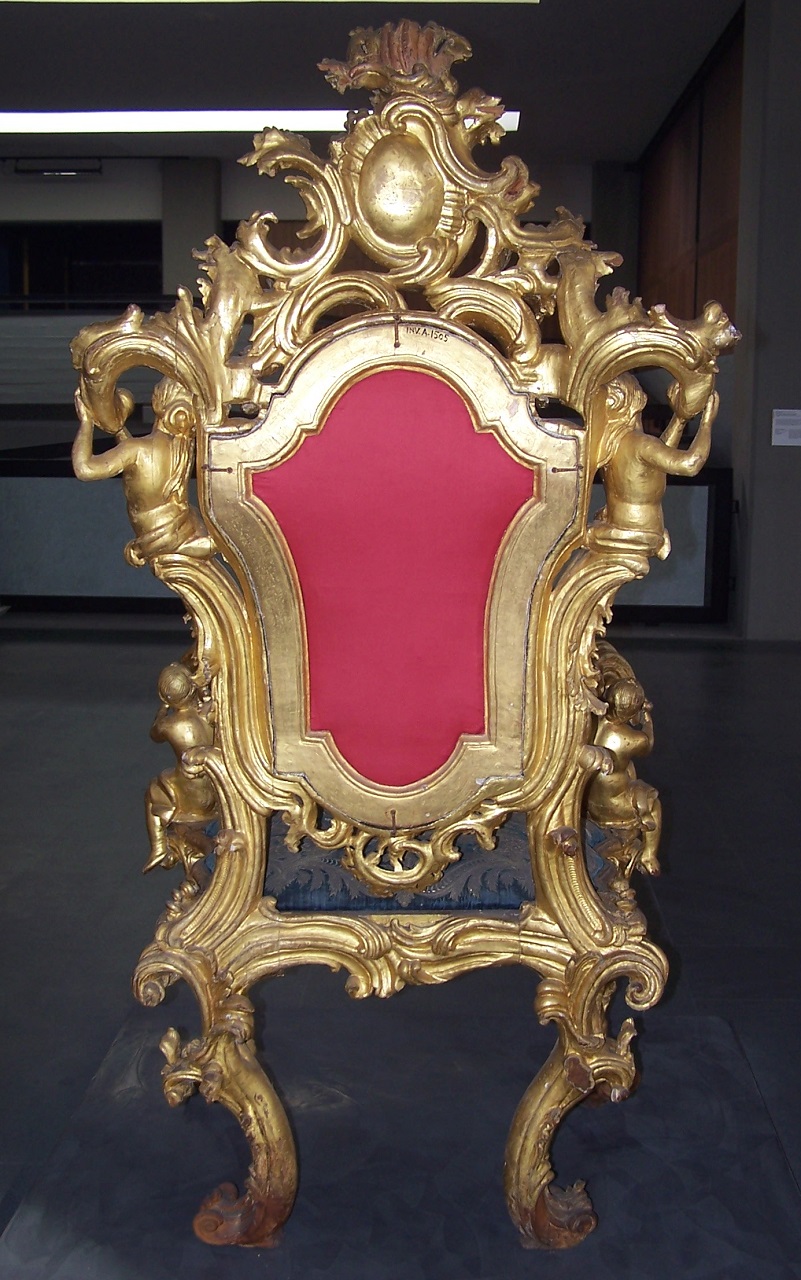 Ricca poltrona intagliata e dorata, presenta un alto schienale con cimasa intagliata a giorno con motivi fitomorfi e cartiglio terminale asimmetrico in cui è racchiusa una placca ovale in ottone dorato con insegna papale a rilievo (tiara tra chiavi incrociate sormontata da croce). La cimasa è retta da due cariatidi a tutto tondo poste simmetricamente ai lati dello schienale. I robusti braccioli, composti dall'intreccio di motivi fitomorfi e terminanti con ampio ricciolo, sono sorretti anteriormente da due figure a tutto tondo in posizione seduta. Le gambe, estremamente mosse, presentano la parte superiore bipartita che si congiunge al ginocchio, tra volute e foglie d'acanto, per terminare in basso, dopo un'ampia curva, a ricciolo estroflesso con piccolo zoccolo sottostante. Anche il retro della poltrona è dorato. La seduta e lo schienale, entrambi originali, sono imbottiti e tappezzati in velluto blu riccamente ricamato con fili d'argento a volute e motivi fito-floreali con vaso centrale