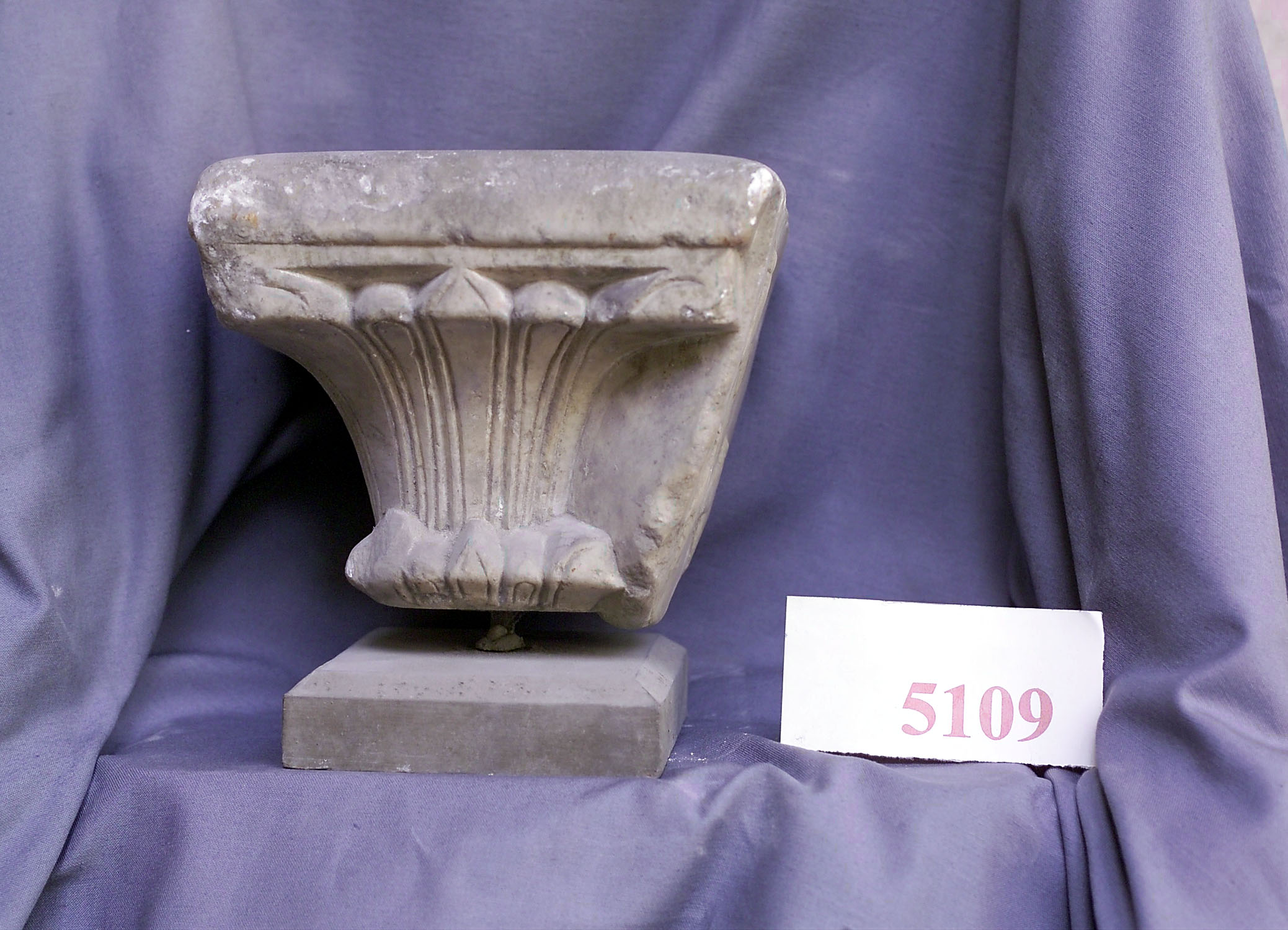 Capitello a foglie stilizzate; su una faccia uno scudo con tre api. Le piccole dimensioni del capitello ne suggeriscono l‘uso a sostegno di colonnine in finestre bifore o trifore, come attestato negli edifici dell‘epoca. L'oggetto è montato su una base in legno