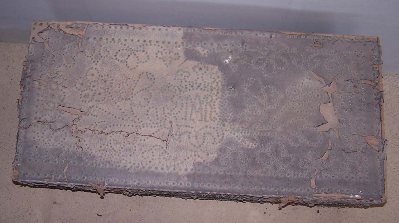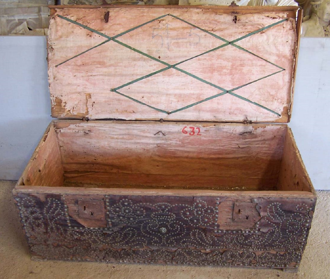 Cassa rettangolare in pino rivestita in cuoio e impreziosita da decorazioni a piccoli chiodi in ottone dalla testa emisferica che compongono motivi floreali e fogliacei. Al centro del coperchio, con la stessa tecnica, è raffigurato il monogramma mariano "MAR" con corona sovrastante. Sulla fronte motivi fito-floreali simmetrici con piccola borchia traforata in ottone a forma di margherita. Sui laterali maniglie in ferro battuto e tracce di rivestimento in cuoio. Sul frontale sono presenti due serrature esterne con chiusura a bandella sagomata fissata sull'orlo del coperchio. L'interno è rivestito di tela dal colore rosa pallido con, sotto il coperchio, nastrino verde disposto diagonalmente a formare ampie losanghe. Retro con tracce di foderatura con carta di colore rosso