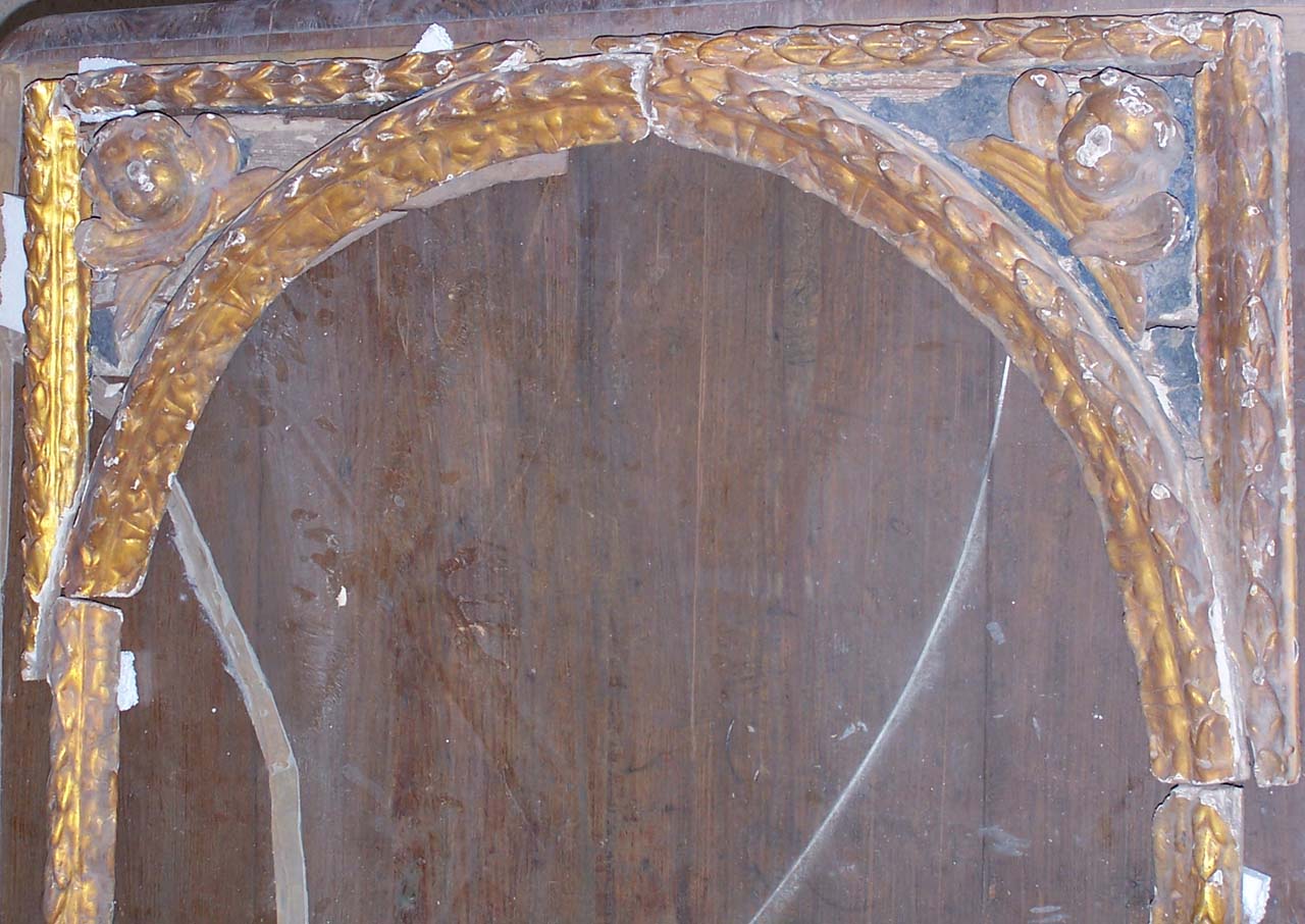 Cornice rettangolare intagliata e dorata, con luce centinata superiormente. Nei due angoli superiori compresi tra la sagoma ad arco della luce e il profilo retto della cornice ("spagliazzi") trovano posto teste di cherubini ad alto rilievo su fondo dipinto con tempera azzurra. Battuta a foglia di cavolo aperta verso l'interno e controbattuta a foglie lanceolate ricorrenti e contrapposte. Profilo piatto. La cornice era applicata direttamente sul dipinto su tavola che conteneva