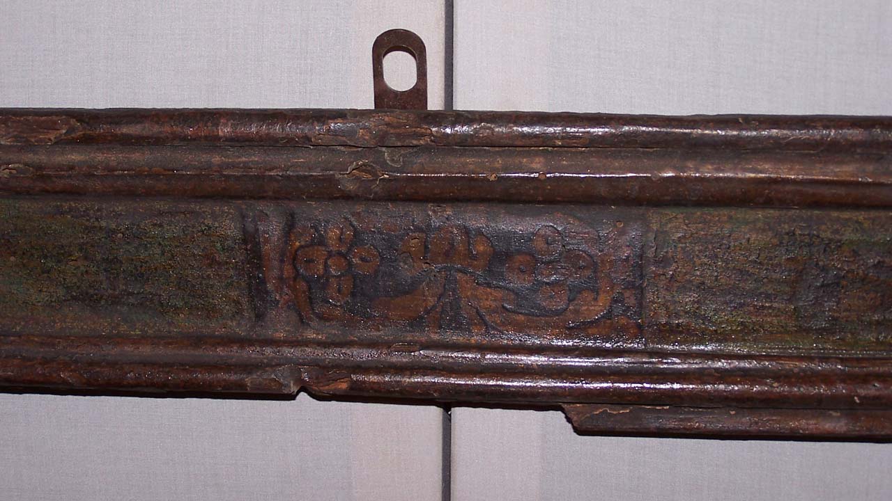 Cornice rettangolare del tipo "a cassetta", presenta la battuta modanata a gola semplice seguita da cordone, forse originariamente dorata, attualmente mordenzata marrone. Fascia centrale piatta dipinta originariamente in verde su sottile imprimitura di gesso, con cartelle centrali e angolari dipinte a volute fogliacee e fiori quadrilobati ad imitazione della doratura su fondo scuro. Profilo modanato, anch'esso, forse, originariamente dorato, che si rileva a gole contrapposte con cordone finale