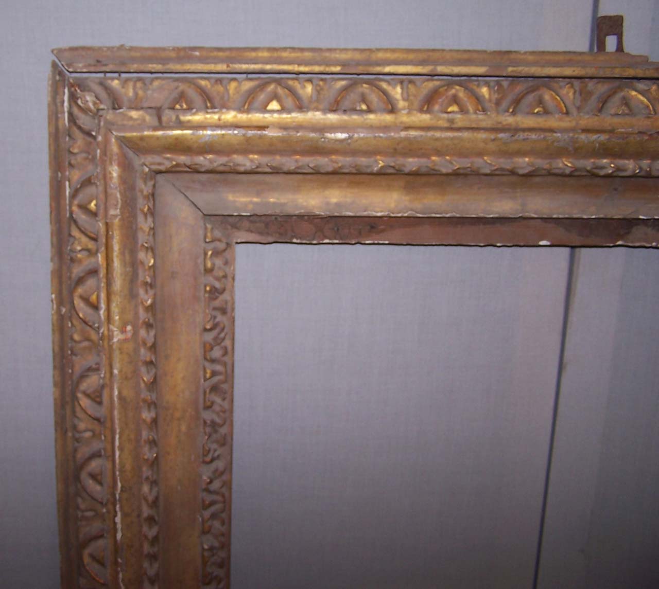 Cornice rettangolare modanata e dorata, con battuta a piccole foglie di cavolo aperte verso la luce. Fascia centrale a gola semplice delimitata da foglioline lanceolate ricorrenti e contrapposte dal centro, seguite da gola rovescia aggettante che digrada profondamente a gola semplice verso controprofilo intagliato a grandi ovoli inrammezzati da foglie stilizzate. Profilo a piccola gola semplice digradante a muro