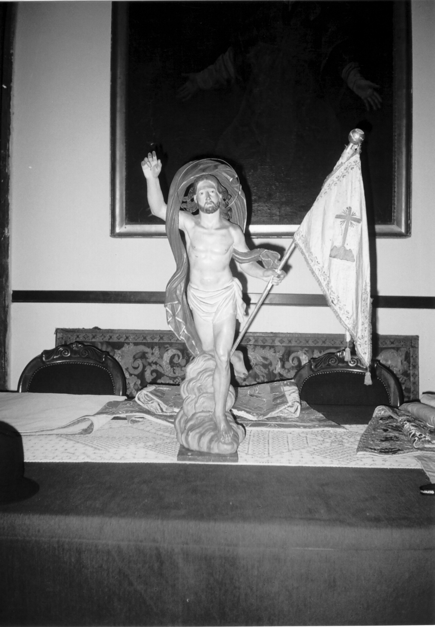 Tipologicamente la statuetta raffigura Cristo risorto con in mano la bandiera sulla quale è raffigurata la croce in gloria sul monte Golgota. Morfologicamente Cristo ha ancora la gamba destra entro una roccia sepolcro dalla quale scaturisce il drappo rosso della Resurrezione
