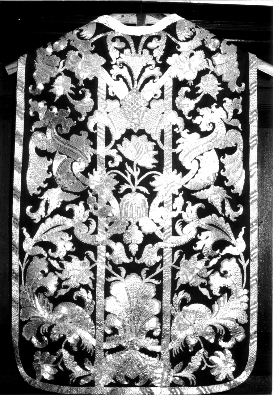 La pianeta dispone i suoi decori su tre fasce verticali di cui la centrale più stretta. I decori si accavallano in un tripudio di ornati elementi fitomorfi, rocailles e girali. In posizione quasi centrica una peonia fiancheggiata da doppie volute