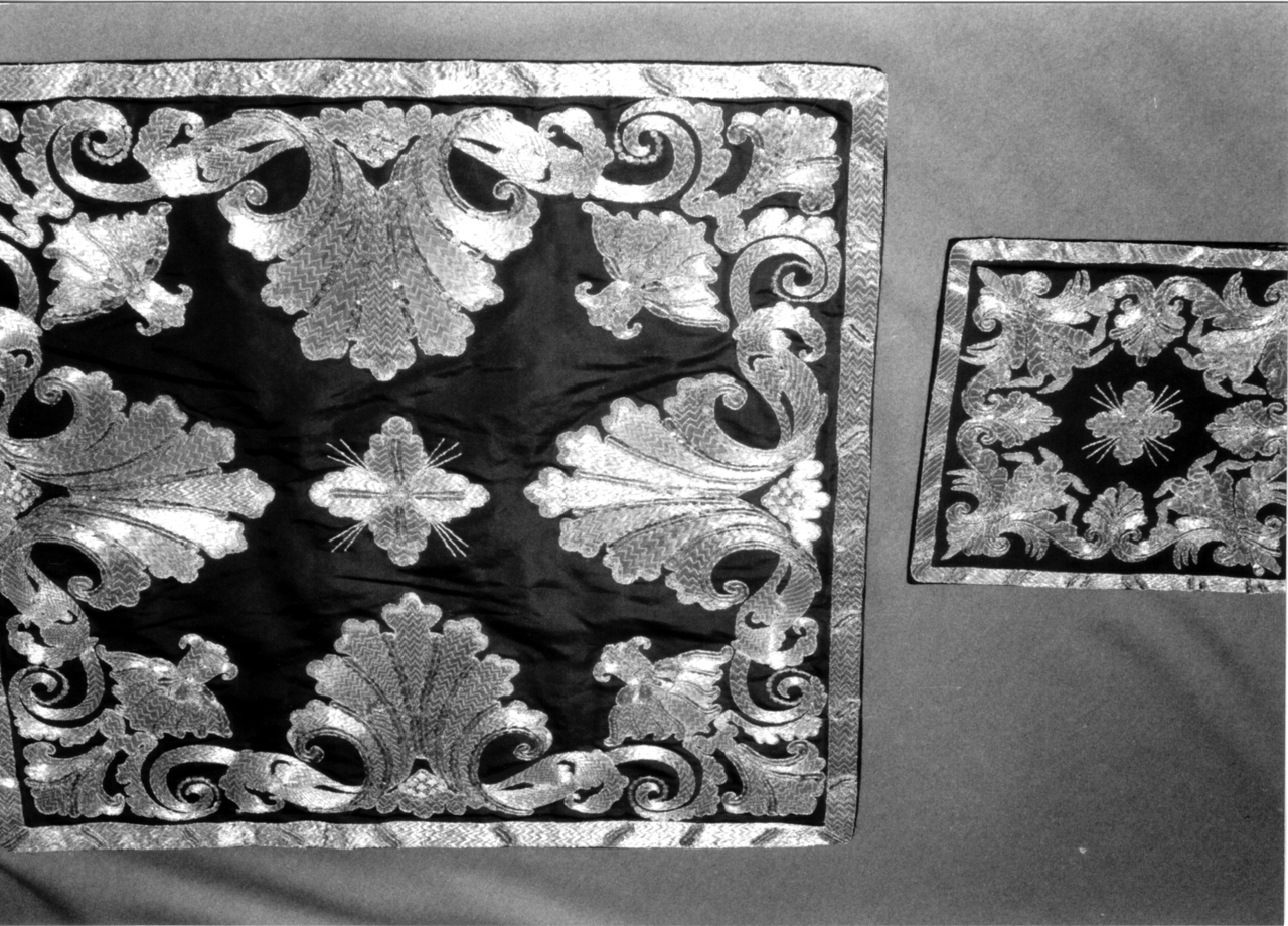 Nel quadrato della borsa sono ricamate con disposizione a prevalenza angolare motivi fitomorfie rocailles. Al centro croce greca raggiata