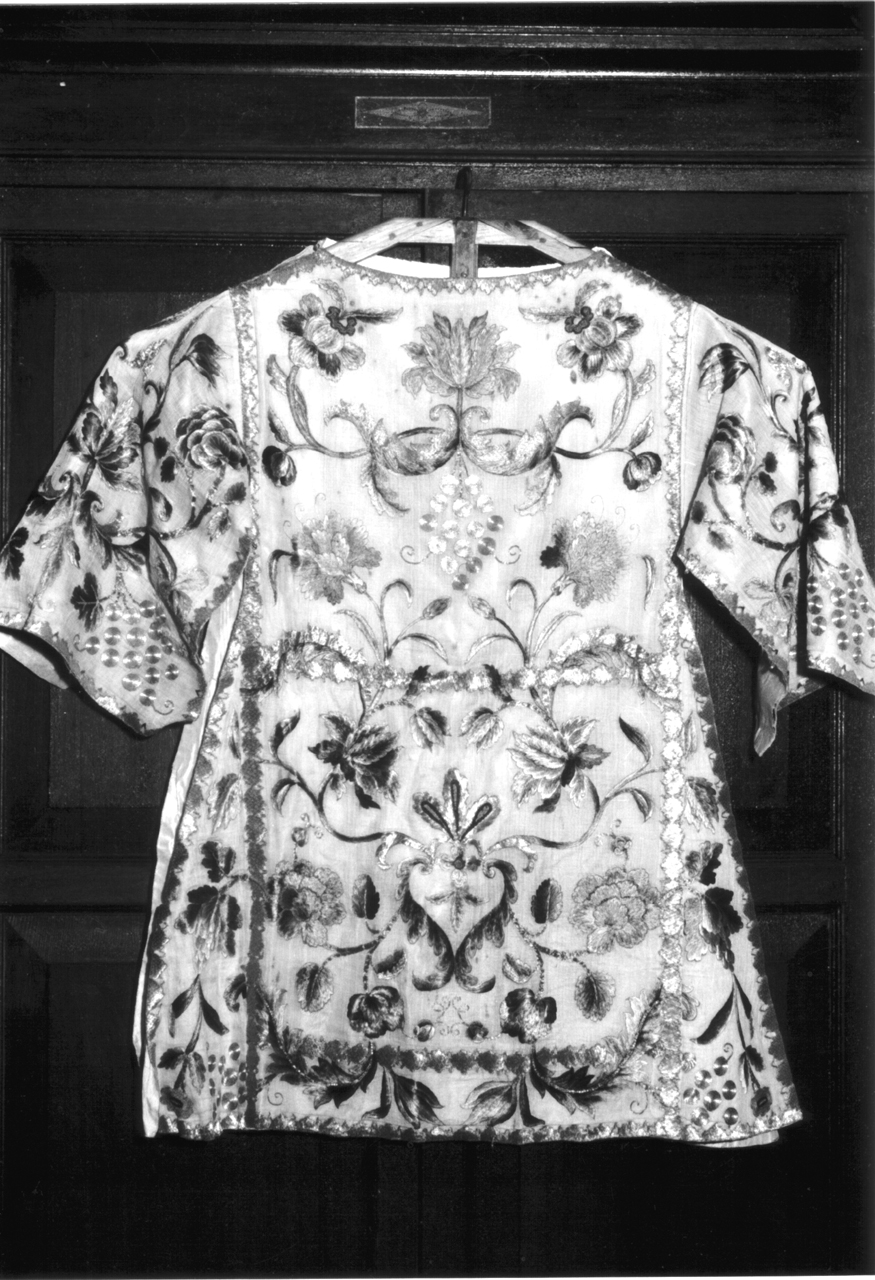 La dalmatica presenta decori analoghi pur se diversamente composti rispetto alla pianeta cui è associata nel parato. Il manufatto riporta un intreccio semplificato di motivi floreali ed elementi fitomorfici sovrapposti alla tipica ripartizione a campi delle dalmatiche di questo periodo. Da un motivo cuoriforme in basso si dipartono ramages con tulipani, peonie, garofani, rose, etc. Sono presenti per ogni faccia cinque grappoli vitinei che rappresentano l‘azione sacrificale, con il versamento del sangue, del Cristo