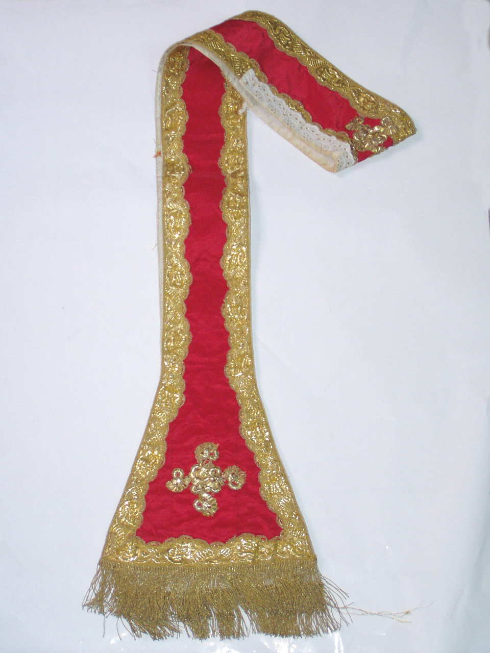La stola è frutto di un rimaneggiamento di un paramento precedente. Accorpa su tessuto nuovo rosso: uno splendido gallone in filo e lamelle d‘oro realizzato a telaio con uno dei lati a polilobi e all‘interno intrecci di pura fantasia, tre croci greche di un gallone eseguito parte a fuselli e parte ad aghi e una alta frangia in filo d‘oro ritorto. Al di sotto del gallone perimetrale in alcuni brani è visibile l‘originario tessuto rosaceo