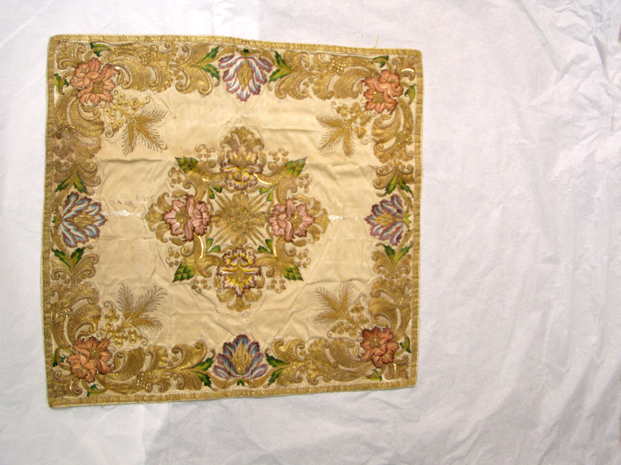 - NOTIZIE STORICO CRITICHE Questo splendido esempio di manufatto è molto probabilmente il prodotto di maestranze di ricamatori alla cui stesura del disegno deve avere collaborato un artista di certa levatura. Nella disposizione a quadrangolo con larga fascia a motivo centrale si sottolinea in chiave teologica il concetto dell‘Ortus Conclusus con al centro la croce greca raggiata amplificata dal polilobo cruciato