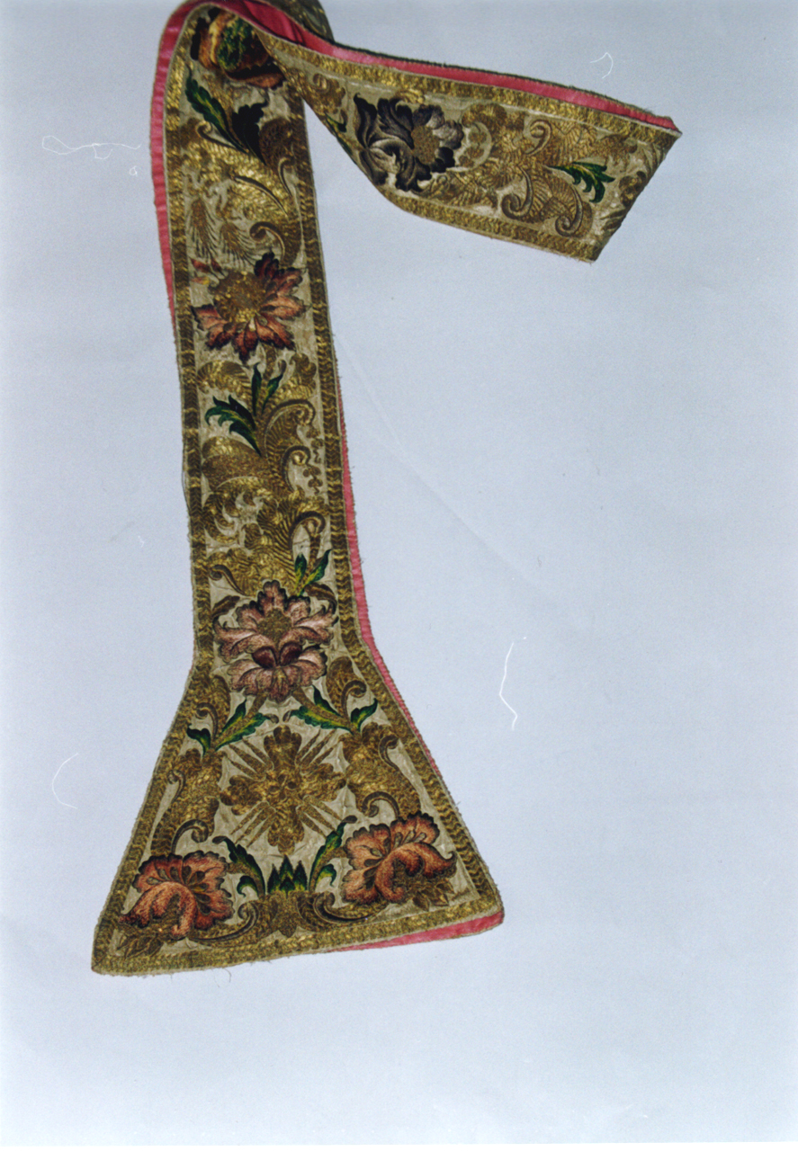 La stola presenta motivi che sono ricamati negli altri elementi del parato, in particolare la pianeta, di cui è parte d‘insieme. Tre le croci raggiate nei posti canonici (centro delle svasature, collo) mentre lo sviluppo del decoro è a fascia e si svolge in modo asimmetrico alternando grandi fiorami policromi a fogliame e spighe in filo d‘oro ricamato a punto posato. Si intercalano volute a rocaille che nella parte più larga hanno stesura simmetrica