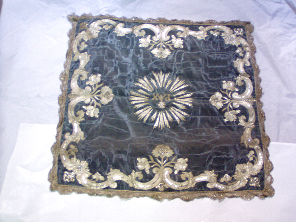 Il velo in seta marezzata azzurra ricamato in argento propone in versione semplificata ma pur sempre di notevole impatto visivo i motivi della pianeta di cui è parte d‘insieme. Al centro entro una raggiera la scritta PAX coronata sulla A da una piccola croce raggiata, tipica dell‘ordine monastico dei benedettini. Contorna il velo un complesso svolgersi di volute e motivi fitomorfi centrato in ogni lato da un mazzo floreale composto da tre rose. Un magnifico gallone in filo d‘argento lavorato a fuselli con motivo a ventaglio perimetra il velo
