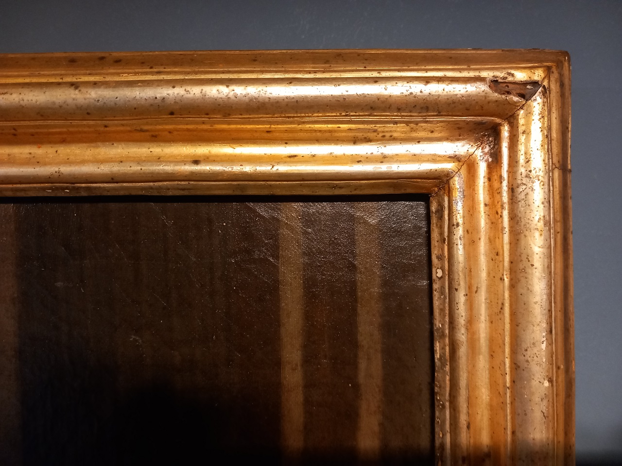 Cornice rettangolare dorata, presenta la superficie modanata a più gole dritte e rovesce contigue che da una sottile battuta si innalzano centralmente per ridiscendere verso un profilo verticale a muro
