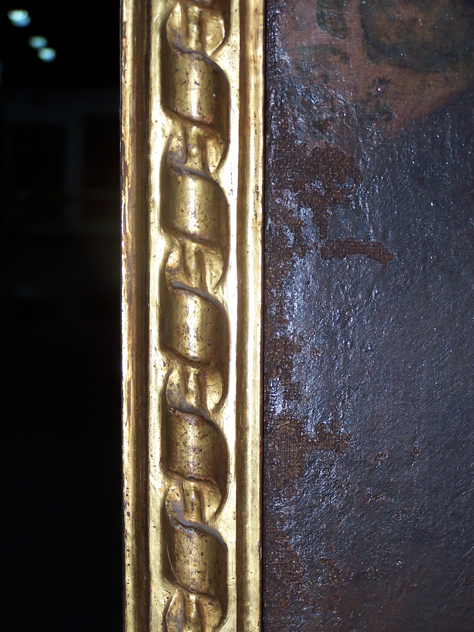 Cornice rettangolare intagliata e dorata con sottile battuta a gola semplice seguita da fascia centrale rilevata a nastro arrotolato su cordone che digrada con doppio sguscio semplice per terminare con profilo piatto perpendicolare a muro