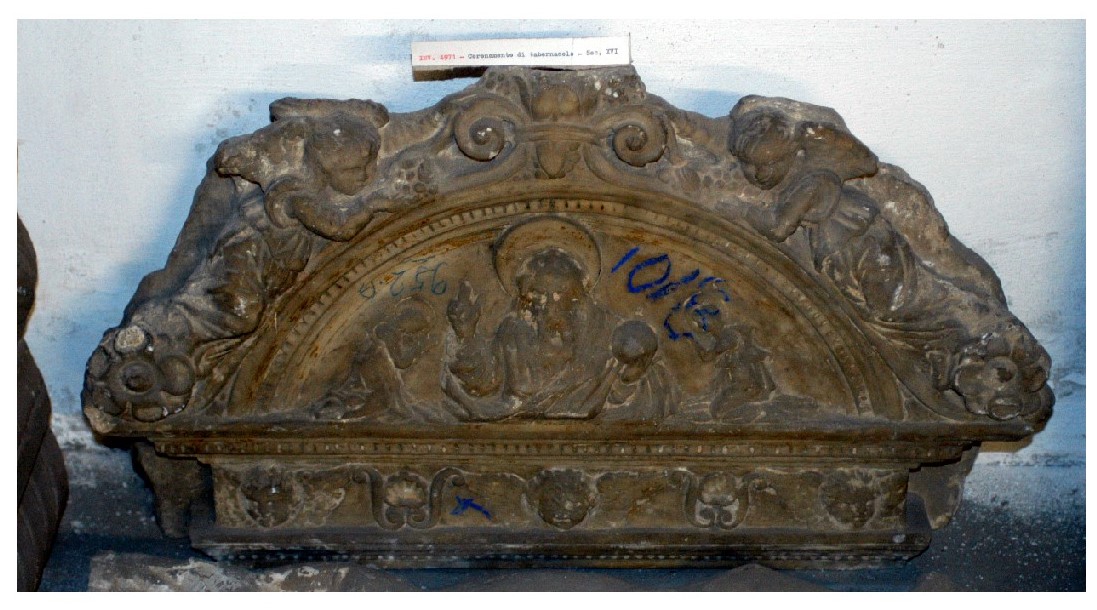 - NOTIZIE STORICO CRITICHE Nell'arte rinascimentale del xv sec. Dio Padre, che è la Prima Persona della Santissima Trinità è rappresentato con la tipica aureola, i capelli lunghi e la barba fluente ed in atto di benedire. Questa iconografia si ritrova sia nelle scene del Vecchio Testamento che del Nuovo. La scultura catalogata, ricca di elementi decorativi, che rispecchia questo tema compositivo risulta artisticamente interessante in quanto è da collocare per i suoi ascendenti lombardi, nell'ambito della bottega di Domenico Gagini, derivata come pare - insieme a tutti gli altri esemplari coevi di tal genere - dal coronamento del tabernacolo dello scultore bissonese della Cappella Palatina in Castelnuovo a Napoli (Abbate 1991). Il grosso frammento scultoreo che è il coronamento del tabernacolo inv.4942 (vedi scheda aggregata OA 050354 ) è annotato insieme al tabernacolo nel vecchio elenco della "Scultura Moderna" del Museo Nazionale di Palermo al n.° 32. Il coronamento insieme al ciborio, proveniente dai magazzini del Palazzo Reale di Palermo, fu donato dalla Real Casa al Museo Nazionale di Palermo che nel 1953 lo devolvette alla Galleria Nazionale della Sicilia