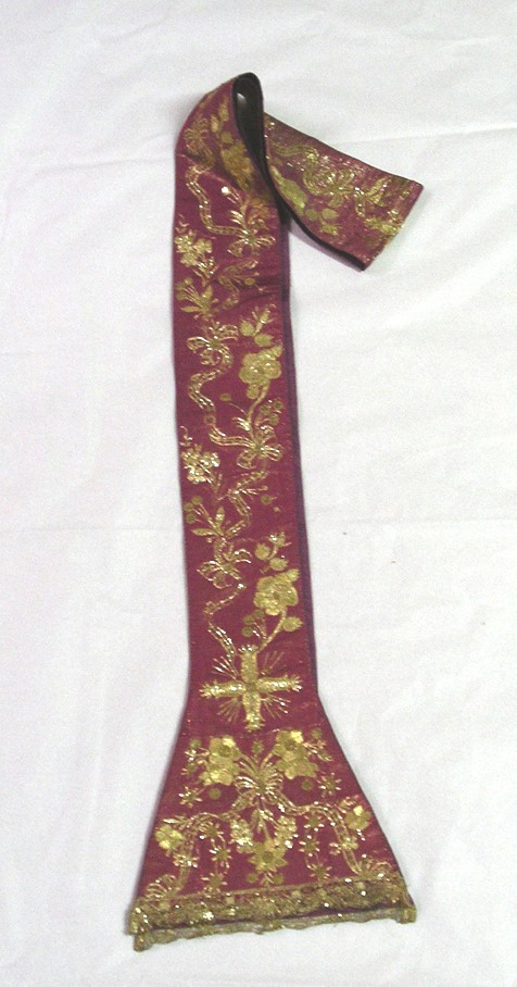 - NOTIZIE STORICO CRITICHE La presenza dei grafismi degli elementi nastriformi, vagamente ispirati alla vaghezza dello stile Luigi XVI e al Neoclassicismo più in generale, nell'esuberante ricchezza dell'ornato di questa stola, in cui grande attenzione è prestata alla resa quasi naturalistica dei fiorami e del fogliame, datano l'opera alla metà del secolo XIX. La ricchezza di questo manufatto gioca sulla sovrapposizione dell'ornato d'oro su tessuto rosso, pur esso tramato d'oro, cosi come la pianeta a cui si associa. Il paramento idealmente rimanda, nell'associazione del nobile matallo e del colore, al significato simbolico del rosso quale colore dell'imperio (ciò fin dall'epoca romana), in questo caso riferito a Cristo Re dell'Universo. Trattasi di produzione di eccelsa qualità, non solo esecutiva ma anche ideativa e concettuale presupponendo, in relazione alla complessità del discorso che vi si svolge, una sicura conoscenza dottrinale