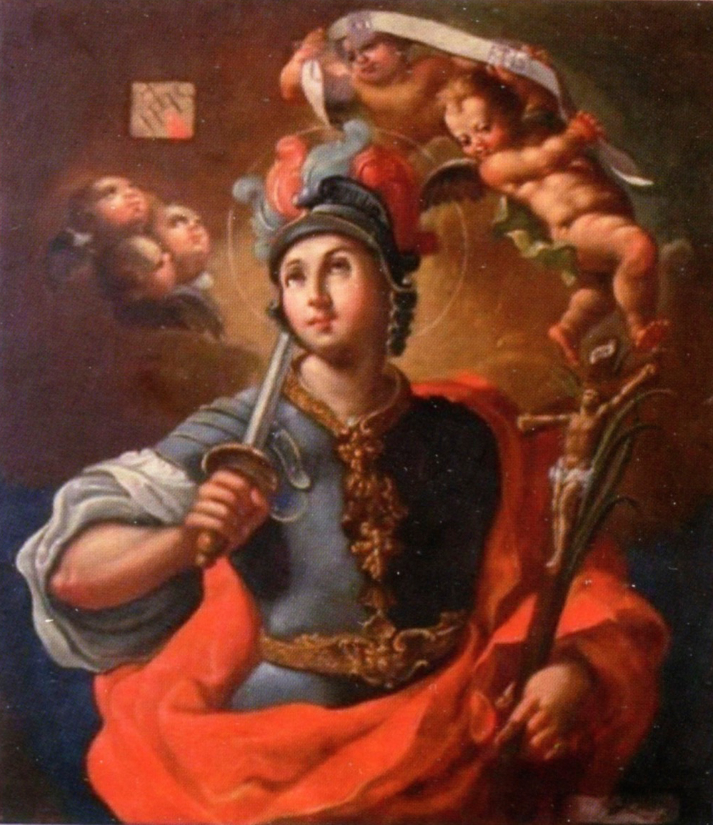 san Calcedonio martire. figura di santo in armatura, avvolto nel "pallium" rosso con elmo piumato che tiene nella mano destra la spada e nella sinistra il crocifisso e la palma del martirio. il santo è circondato da putti e cherubini