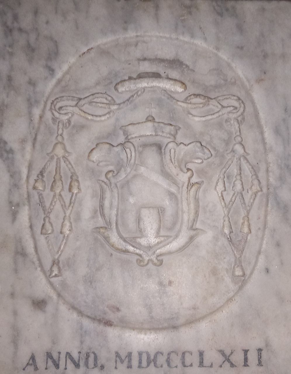 Lastra rettangolare a pavimento in marmo bianco. Al centro presenta uno stemma scolpito a basso rilievo con fondo ribassato raffigurante, entro volute fito-floreali simmetriche e corona superiore, un calice in basso e una banda trasversale in alto. Lo stemma è sormontato da cappello prelatizio. Al di sotto dello stemma vi è una lunga iscrizione (vedi campo ISR). In prossimità degli angoli si trovano robusti occhielli in ferro per il sollevamento della lastra inseriti in riserve circolari concave con decorazioni a petali a bassissimo rilievo