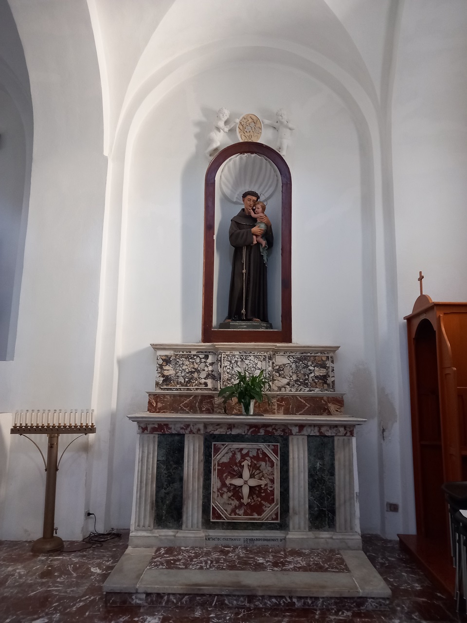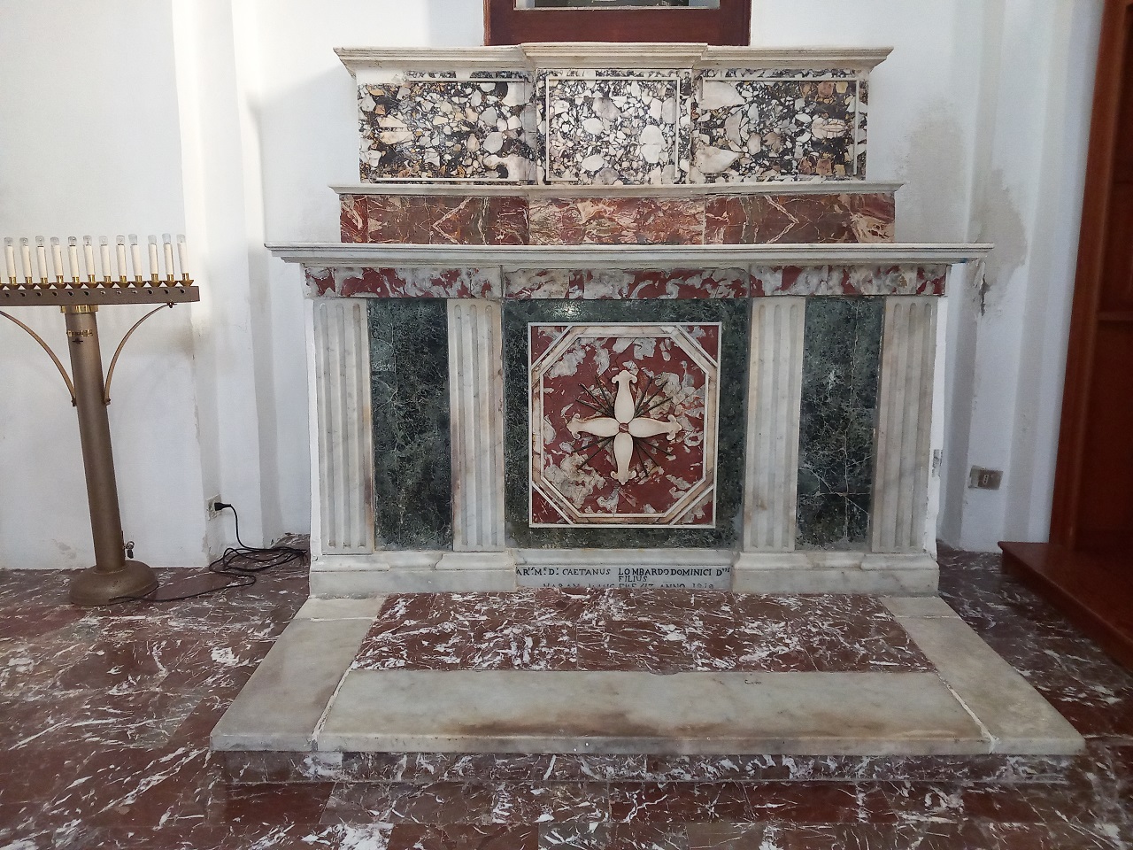 - NOTIZIE STORICO CRITICHE L'altare, nella sua semplicità, denota caratteristiche assimilabili al periodo Impero (lesene scanalate) che confermano la data impressa nell'iscrizione (1819?) per quanto questa sia parzialmente coperta dalla pavimentazione della pedana su cui poggia l'altare. Come testimonia una piccola lastra di marmo posta sul fianco destro dell'altare questo subì nel 1977 una sorta di restauro su commissione dei discendenti