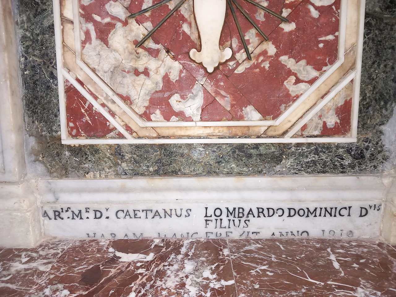 - ISCRIZIONI Sulla cornice di base della mensa - AR.is M.e D.v CAETANUS LOMBARDO, DOMINICI D.vis FILIUS HARAM HANC EREXIT ANNO 1819(?) - capitale -