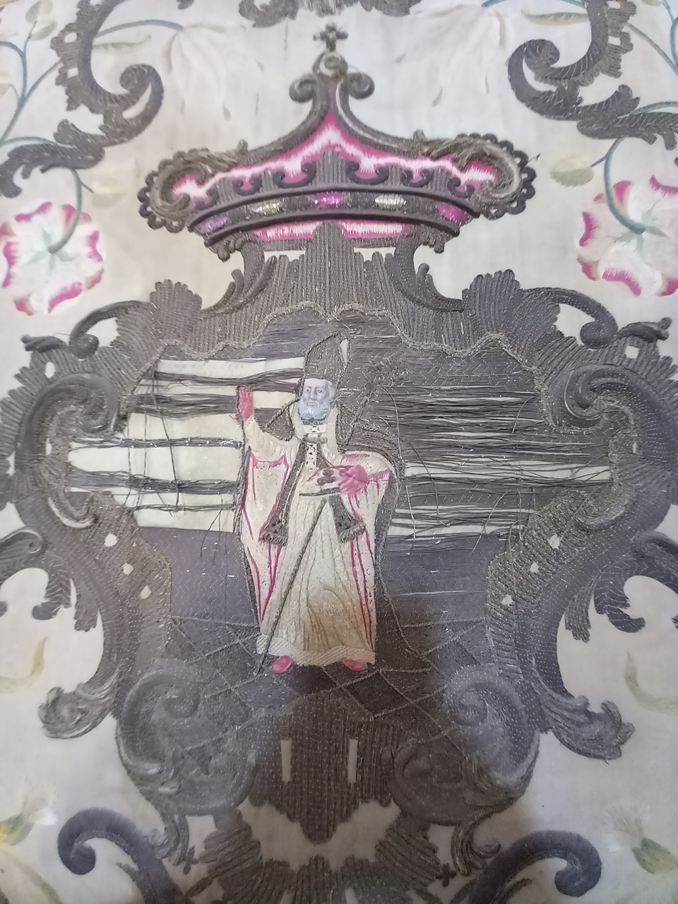 Il paliotto, ricamato con fili dorati e policromi su fondo beige, presenta al centro uno scudo coronato con all'interno la figura, dal volto dipinto, di San Nicola stante in atto di benedire con la mano destra mentre con la sinistra trattiene il bacolo. Tutt'intorno vi è una decorazione a ricamo con simmetriche volute fogliacee in filo dorato che creano delle riserve in cui trovano posto elementi floreali policromi ricamati. Il paliotto è inserito in una cornice dorata non coeva (sec. XX)