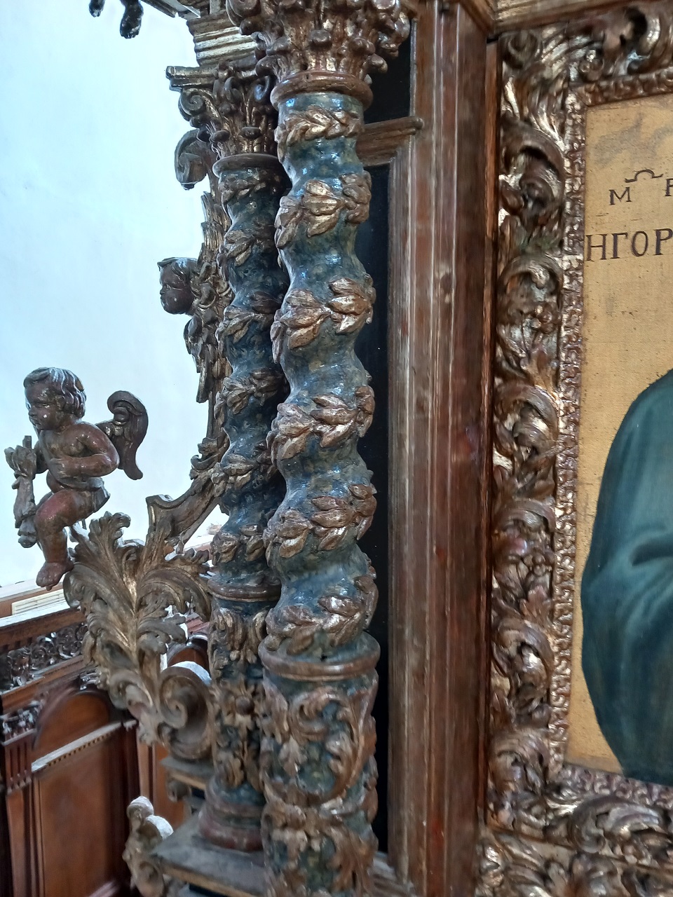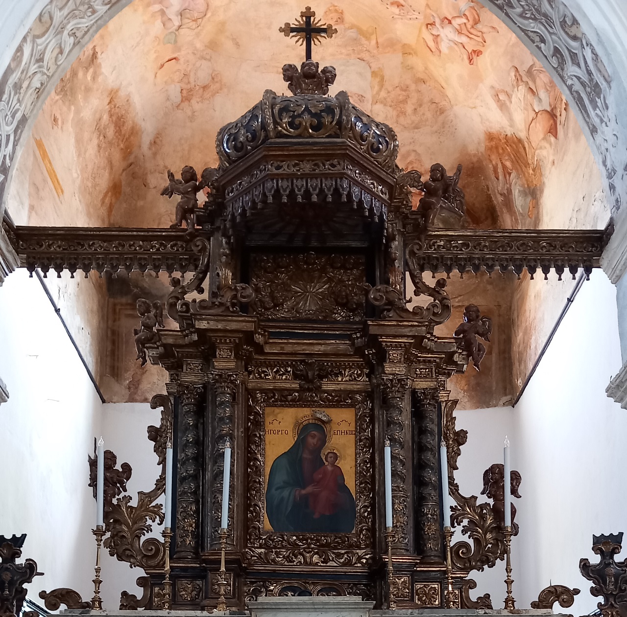 Imponente struttura architettonica lignea posta al di sopra dell'altare maggiore in posizione leggermente arretrata. La mostra d'altare presenta due coppie di colonne binate sfasate per lato con parte inferiore cilindrica e superiore tortile con decorazioni fitoformi, terminanti con capitelli compositi che sostengono una complessa trabeazione a cornici modanate aggettanti che funge da base del baldacchino. Quest'ultimo presenta un cupolino di forma semi-ottagonale "a cipolla" con superfice esterna decorata a girali fogliacei a rilievo e bordo a lambrecchini pendenti, mentre sul cielo interno è raffigurata la colomba dello Spirito Santo con raggi, sempre intagliata a bassorilievo e dorata, su fondo dipinto in celeste. Frontalmente, inoltre, sul fondo tra la trabeazione e il cupolino del baldacchino, vi è un paliotto intagliato e dorato ad alto rilievo raffigurante i raggi dello Spirito Santo attorniati da teste di cherubini. I laterali dell'intera struttura lignea sono impreziositi da putti a tuttotondo seduti su plastici girali fogliati e agli angoli del cornicione della trabeazione. All'apice della cupola, infine, tre teste di cherubini a tutto tondo fanno da base a una croce dalle estremità trilobate con sole raggiante alle spalle. Al centro della struttura, racchiuso da bella cornice a motivi fogliacei, si trova il dipinto raffigurante la Madonna della Lettera (vedi scheda 1900425497). La trave posta in alto che, attraversando orizzontalmente tutto l'arco absidale, sorregge la parte superiore dell'apparato ligneo, è decorata frontalmente con fregi fogliacei dorati a rilievo racchiusi superiormente da cornice modanata e fitta serie di lambrecchini pendenti