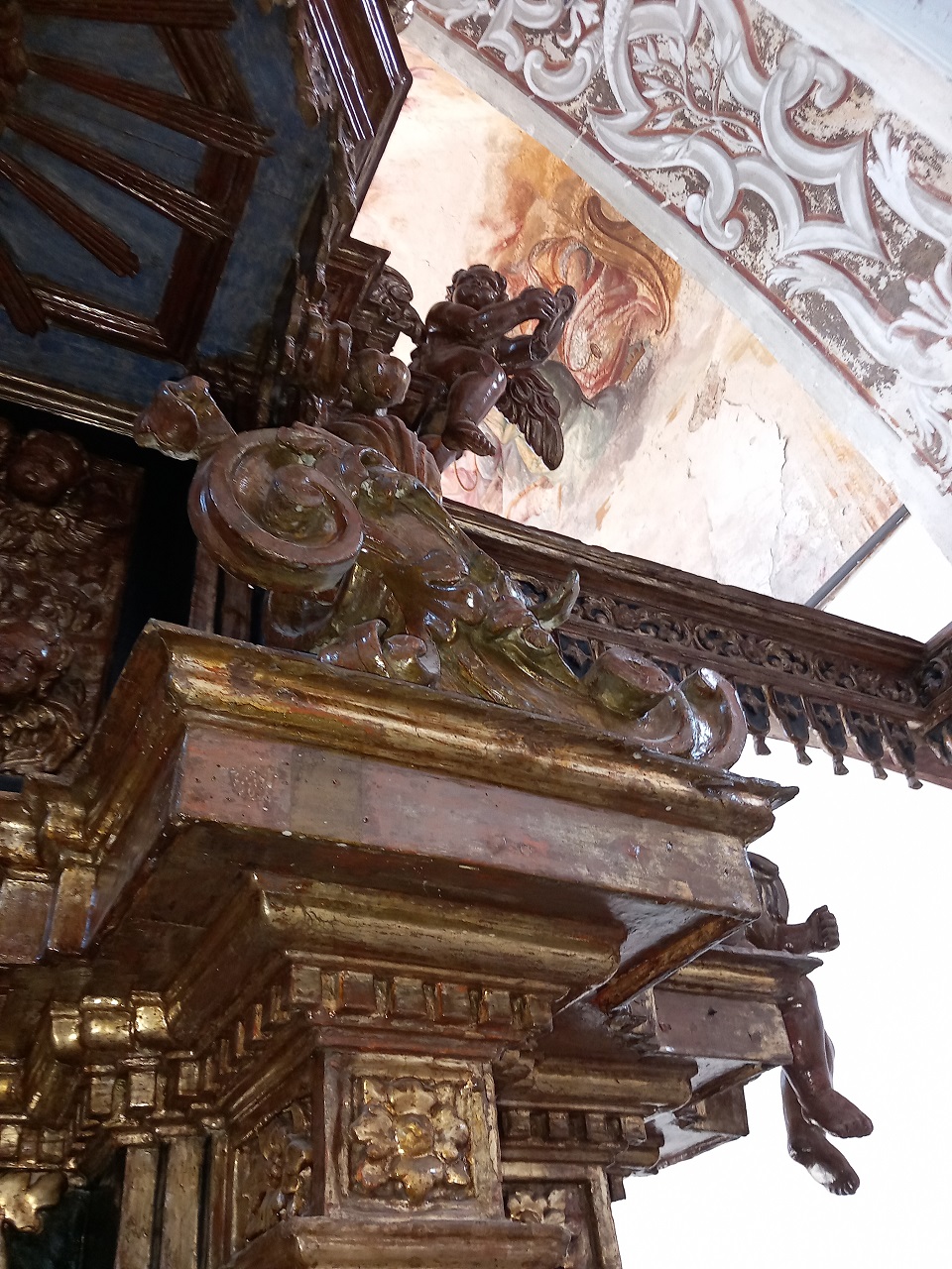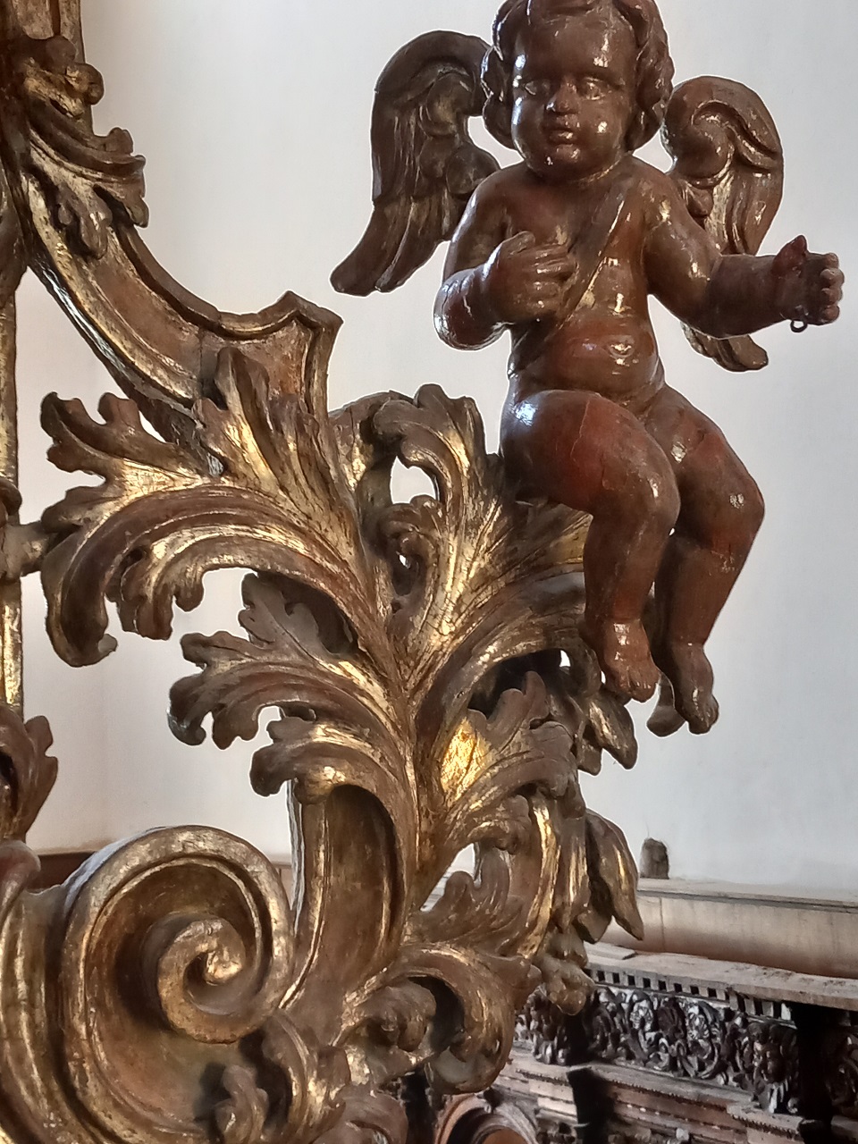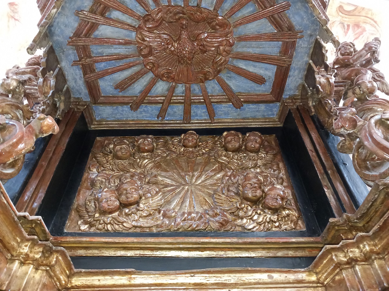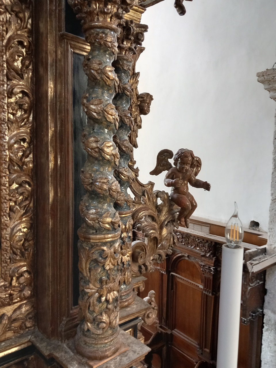 Elementi architettonici con decorazioni vegetali, putti e colomba dello Spirito Santo (baldacchino d'altare, opera isolata) di Frate Giacomo della Rocca (bottega) (XVII)