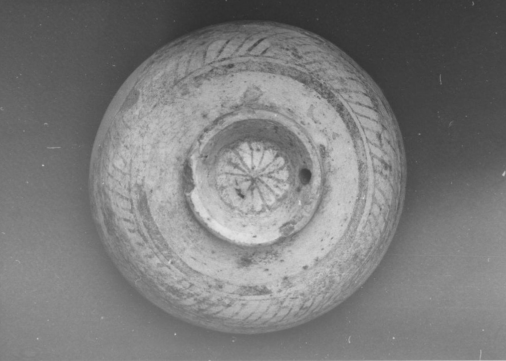 Piede cavo carenato rilevato con foro di sospensione, ventre piatto, pancia rigonfia, leggere carena spalle dritte bordo arrotondato. Decorazione interna dell'incavo centrale si dipartono otto strisce radiali intrecciate similmente ad un nastro e campiti con motivi geometrici a zig zag e racemi intrecciati di stile egizio; gli otto spazi così ottenuti in forma di triangolo isoscele sono campiti con racemi; nei colori marrone dorato e celeste su fondo bianco. Decorazione esterna a bande parallele raccordate da linee oblique marrone, correnti. Rosetta marrone inscritta nell'incavo del piede. Superfici: interna ed esterna vernice bianco sporco (esterna ruvida). Impasto rosa chiaro compatto ben depurato. Lavorazione a tornio