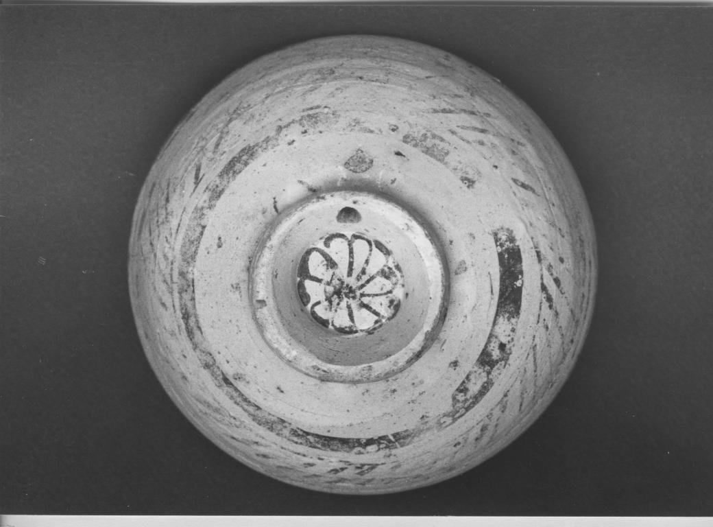Piede cavo, carenato, con foro di sospensione; ventre piatto; pancia globosa; spalle leggermente divergenti; bordo arrotondato. Decorazione interna: incavo centrale con quadrato campito a motivi geometrici sui cui 4 lati si impostano altrettante foglie stilizzate di colore azzurro, negli spazi rimanenti motivi geometrici e vegetali color marrone su fondo beige; rosetta marrone inscritta nell'incavo del piede. Superfici: interna ed esterna vernice beige. Impasto giallo chiaro, compatto, ben depurato. Lavorazione a tornio