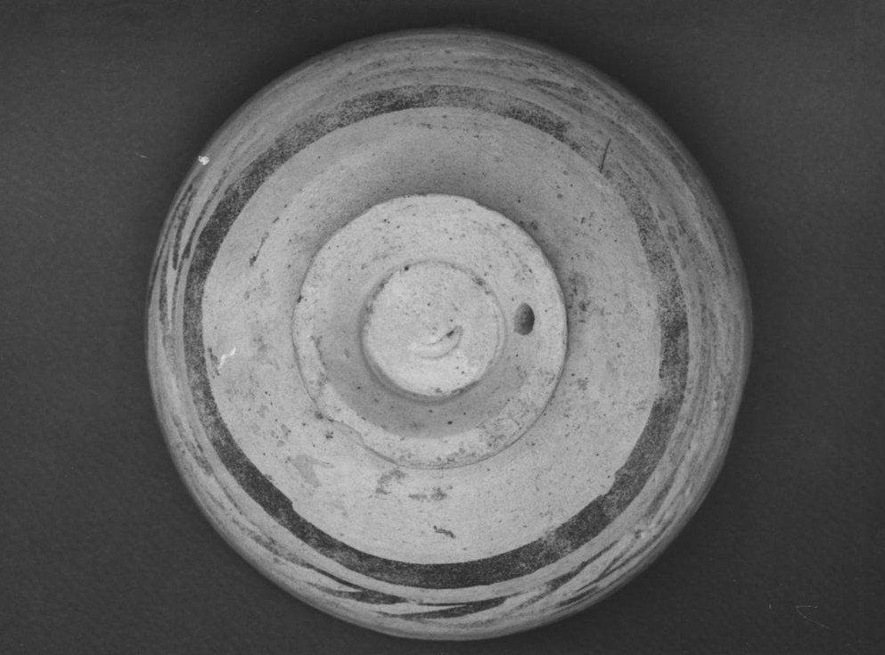 Piede cavo carenato rilevato con foro di sospensione, ventre e pancia piatti, pancia e spalle distinte, spalle rigonfie, orlo sottile arrotondato. Decorazione interna: dall'incavo centrale si dipartono otto sottili petali raccordati da archi che si incrociano, il tutto inscritto in una circonferenza; la seconda fascia com metope campite probabilmente a motivi vegetali. Decorazione esterna: strisce parallele a spina di pesce corrente, probabile striscia sulla carena del piede. Superfici: esterna ed interna bianco sporco (esterna più ruvida). Impasto giallo chiaro compatto, ben depurato. Lavorazione a tornio