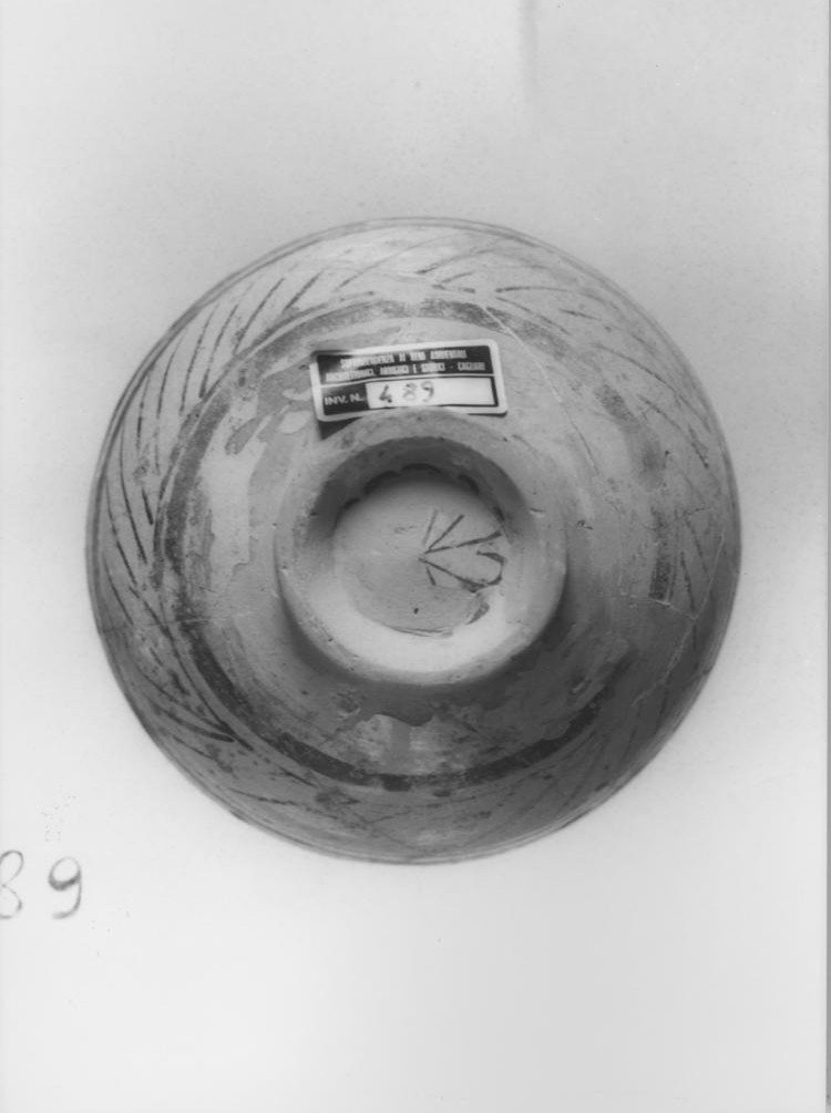 Piede cavo rilevato, ventre piatto, pancia tondeggiante, orlo arrotondato. Decorazione interna: motivi geometrici e vegetali bianchi, marrone dorato e bleu inquadrati in un reticolo di bande color bleu convergenti al centro in un rosone formato da due quadrati intersecantesi e motivo floreale. Decorazione esterna: bande orizzontali nei colori marrone e bleu, raccordati da linee oblique marrone correnti; fiore inscritto nell'incavo del piede. Superfici: vernice beige, liscia. Impasto beige, depurato. Lavorazione a tornio