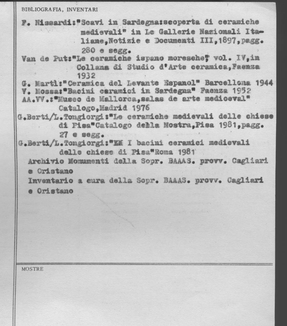 - NOTIZIE STORICO CRITICHE Nonostante l'incertezza del luogo di ritrovamento(Pula? Settimo S.Pietro?), la ceramica è sicuramente del tipo azzurra e a riflesso come quelle del lotto di Pula.Anche questo gruppo è in gran parte importato direttamente a Paterna e a Manises (Valencia) dove le maestranze di formazione iberica ed araba collaboravano sia nelle tematiche sia nelle tecniche; giunse in Sardegna sotto la protezione della famiglia Bojl che, avendo la signoria su Manises, aveva interesse ad incrementare tale commercio.Nella ceramica azzurra e a riflesso confluiscono elementi iberici arcaicizzanti (croci-stemmi.spirali etc) ed elementi arabi ("alafias:riquadri campiti con la parola araba "felicità") ed, ancora, orientaleggianti (palmette egizie etc)