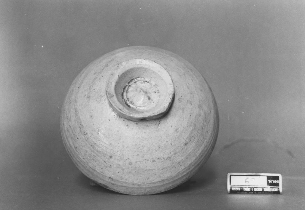 Piede cavo leggermente carenato rilevato; foro di sospensione. Ventre ricurvo, pancia emisferica, spalle dritte. Orlo sottile arrotondato, decorazione interna: dall'incavo centrale si dipartono sei bande radiali che individuano sei spazi campiti alternativamente con piume di pavone reale e palmette stilizzate, nei colori celeste e marrone su fondo beige. Superfici: vernice beige. Impasto rosa carico ben depurato. Lavorazione a tornio