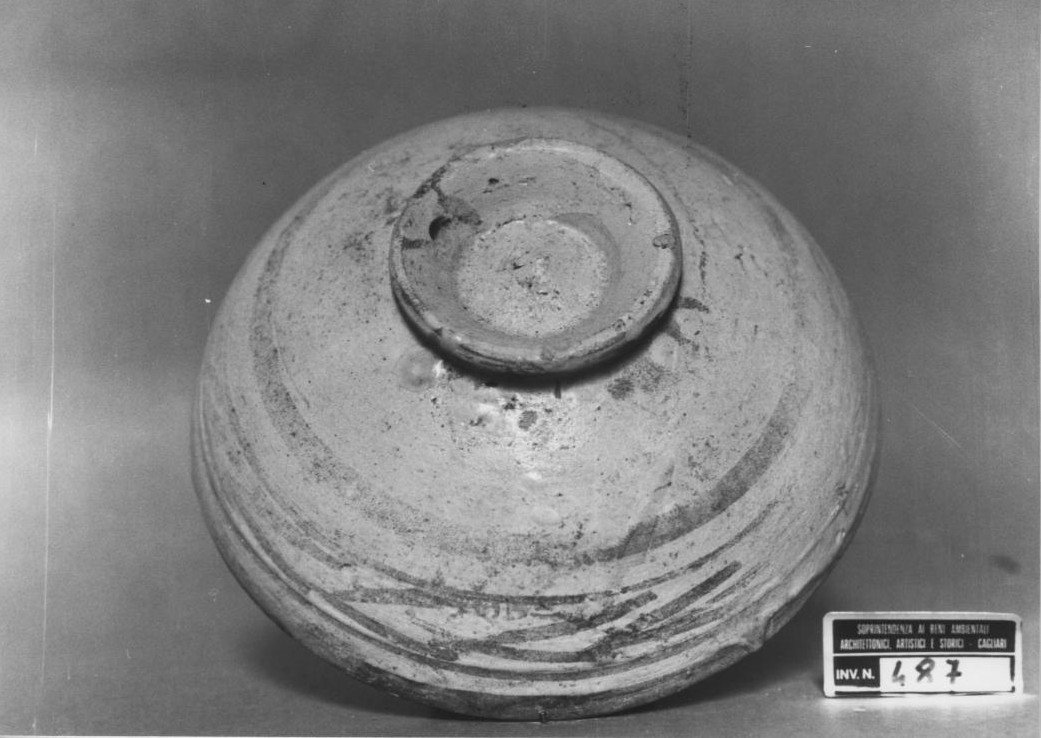 Piede cavo carenato con foro di sospensione, ventre piatto pancia tondeggiante e spalle non distinte, orlo sottile arrotondato. Decorazione interna: tre pesci convergono nell'incavo centrale individuando tre spazi campiti a motivi geometrici o forse lettere arabe e punti; nei colori azzurro e marrone su fondo beige, decorazione esterna a bande parallele marrone e motivi a spina di pesce correnti. Superfici: int. ed est. vernice beige. Impasto beige rosa depurato. Lavorazione a tornio