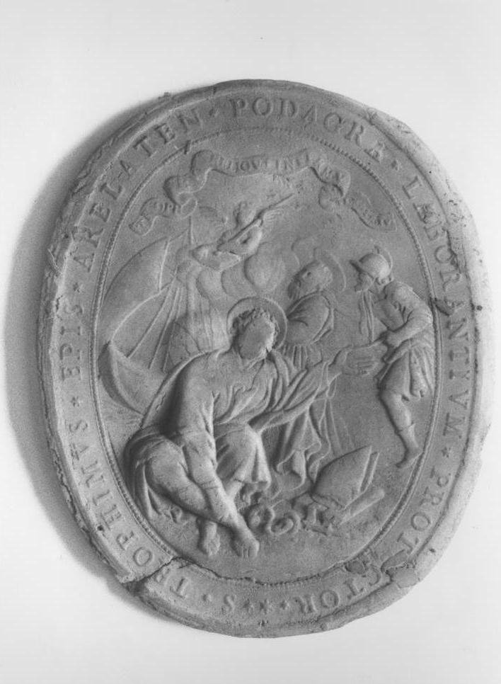 Il Santo, con accanto i simboli vescovili (libro, mitra), intercede a favore dei sofferenti di podagra (indica il piede). Più indietro lo stesso è condotto da un soldato su una imbarcazione. In alto un angelo ed il cartiglio. Stemma sul rovescio. Due frammenti restaurati