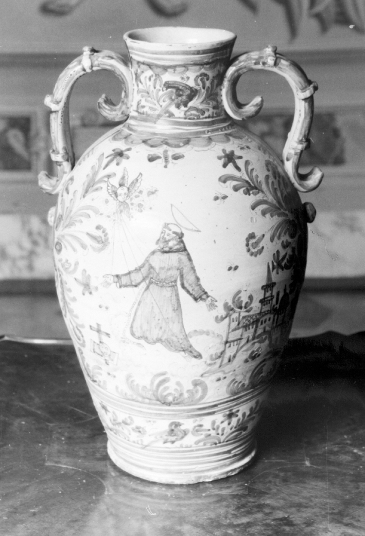 - NOTIZIE STORICO CRITICHE Il vaso ha sicuramente una funzione decorativa e non possiamo escludere, dato il soggetto religioso, un legame con l'ambito conventuale. La forma a "bombola" con anse plasticamente elaborate, l'impasto rosa aranciato, e l'uso del monocromo turchino su smalto bianco in stile "compendiario", ci riportano ad ambito siciliano, probabilmente ad officina caltagironese, che nel corso del XVIII secolo fece grande uso di questo genere di prodotti, ispirati alle importazioni liguri, ma ritardati stilisticamente di oltre mezzo secolo. Scompare in questo periodo l'uso dei tocchi in bianco e la decorazione in blu e la decorazione in blu è organizzata in quartieri o zone, o, come in questo caso, contenuta entro ampia metopa. Vegetazione e sfondi di paesaggio sono di chiara ispirazione ligure, anche se qui si predilige lo sfondo bianco nitido e coprente