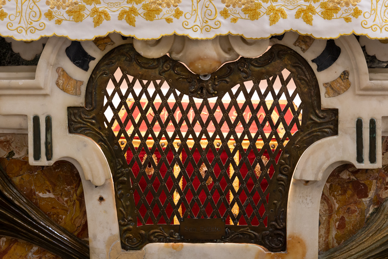 cassetta reliquiario foderata in stoffa con iscrizione