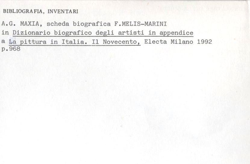 - NOTIZIE STORICO CRITICHE Felice Melis Marini (Cagliari 1871/1953), figlio dell'architetto Enrico, dopo il diploma a Cagliari, si recò a Roma dove studiò alla scuola Libera del Nudo e poi a Venezia alla Accademia. Dal 1927 al 1932 si trasferì a Milano dove frequentò illustratori; scelse di essere un incisore e le sue opere sono presenti in numerose raccolte pubbliche: oltre 400 nella Biblioteca Universitaria di Cagliari