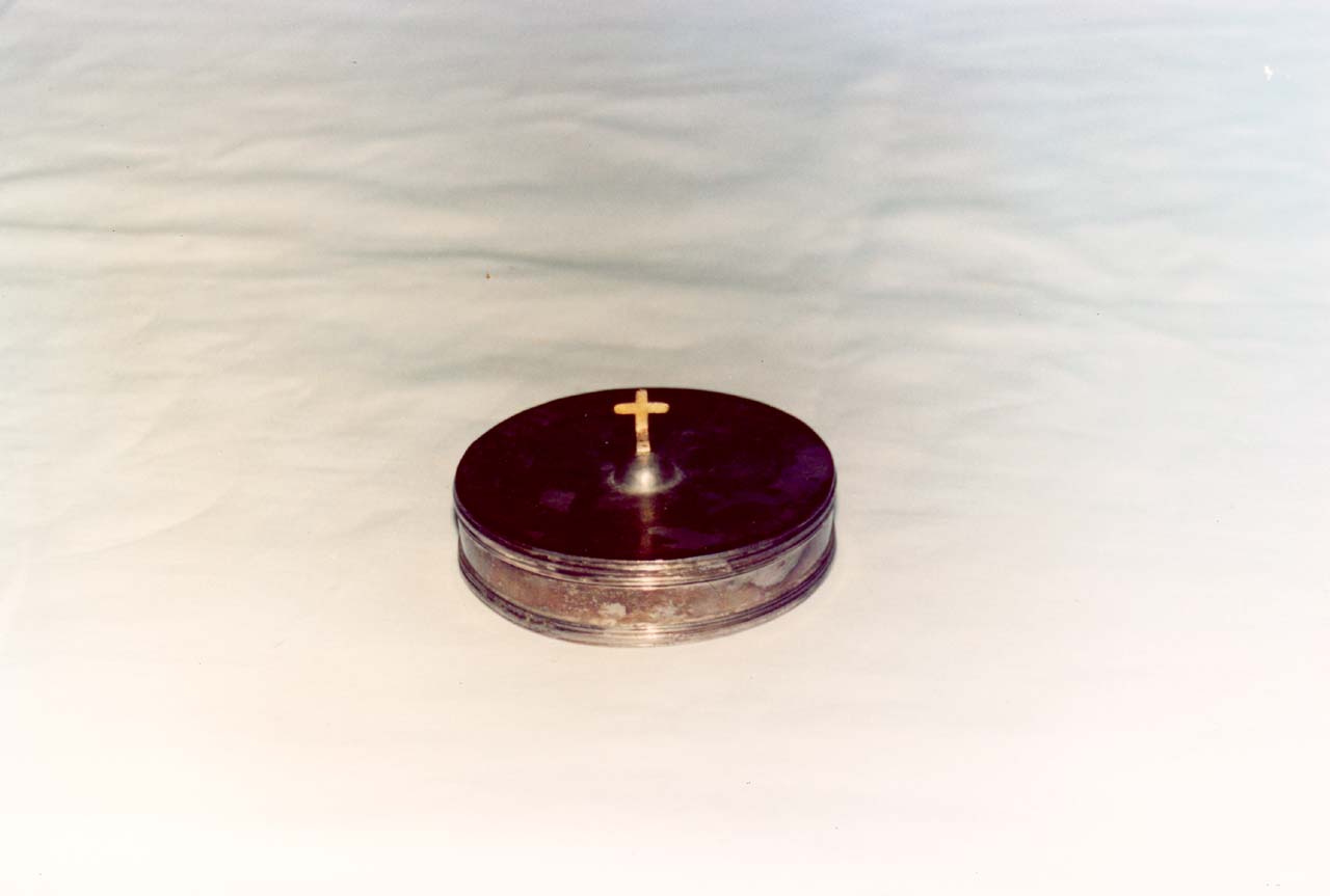 Scatola cilindrica piuttosto bassa sul cui coperchio è una piccola croce dorata
