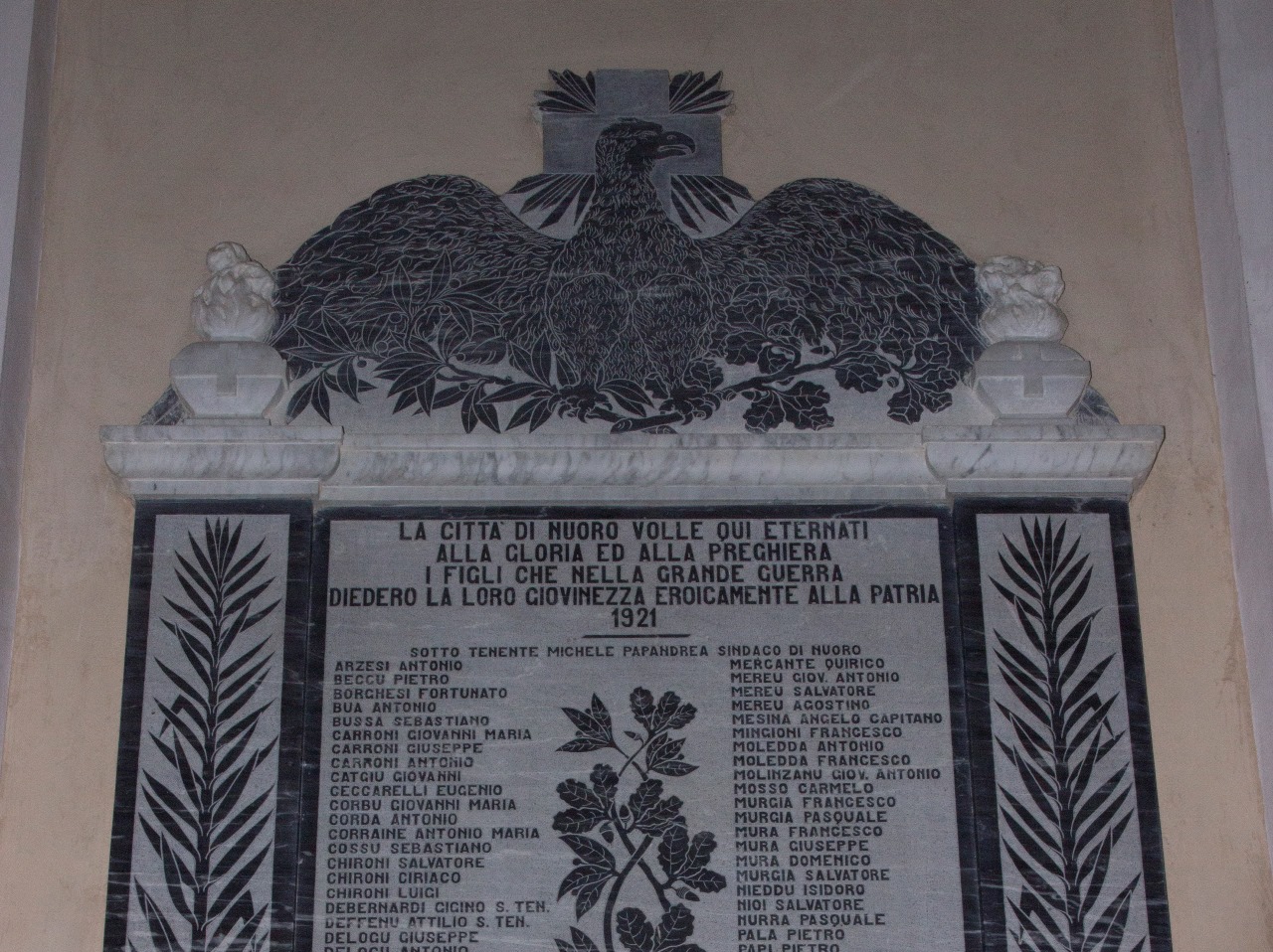 - NOTIZIE STORICO CRITICHE Il Giornale d’Italia (Nuoro. La lapide dei caduti, 11 gennaio 1921) informa che il monumento -opera di un marmista cagliaritano- era stato inaugurato il giorno precedente dal vescovo Mons. Canepa. Era stato però il parroco della cattedrale, il canonico Daddi, a promuovere la sottoscrizione attraverso cui si reperirono i fondi per la realizzazione della lapide. Nonostante non sia menzionato dalla fonte, è plausibile proporre l’attribuzione dell’opera a Luigi Onali, marmista cagliaritano, autore di almeno due lapidi ai caduti: quella di Gadoni e quella di Villasor (NCTN 2000203164 SBAPSAE CA). Quest’ultima, firmata e datata al 1919, presenta ragguardevoli tangenze stilistiche e iconografiche con l’opera oggetto di catalogazione: pressoché palmare è il confronto con l’aquila che, anche nel caso di Villasor, funge da fastigio