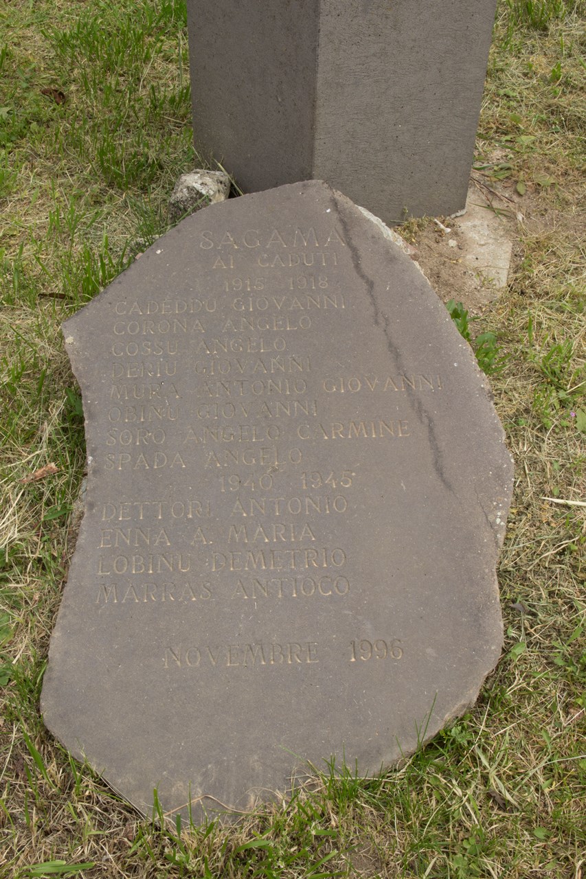 - ISCRIZIONI sulla lastra in basalto davanti alla stele centrale - SAGAMA AI CADUTI/1915 1918/CADEDDU GIOVANNI/CORONA ANTONIO/COSSU ANGELO/DERIU GIOVANNI/MURA ANTONIO GIOVANNI/OBINU GIOVANNI/SORO ANGELO CARMINE/SPADA ANGELO/1940 1945/DETTORI ANTONIO/ENNA A.MARIA/LOBINU DEMETRIO/MARRAS ANTIOCO/NOVEMBRE 1996 - maiuscolo -
