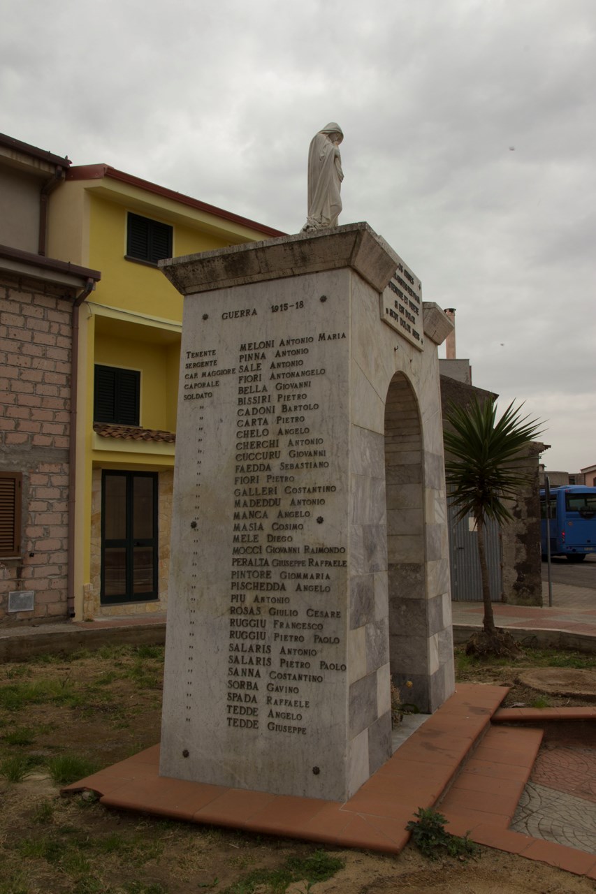 Sobrio monumento in forma d'arco, rivestito da lastre di marmo bianco e dotato di una cornice liscia. In alto è una statuina di Madonna orante. Al centro, nel coronamento, è fissata con borchie di bronzo una lastra, recante un'epigrafe dedicatoria. All’interno del fornice è un piccolo elemento cubico in marmo, il quale reca un’ulteriore iscrizione di dedica. Sui fianchi si trovano: a sinistra l’elenco dei caduti della Grande Guerra; a destra quello della guerra di Spagna e della seconda guerra mondiale