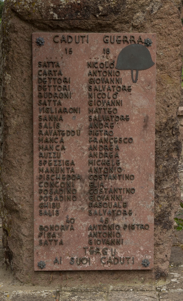 - ISCRIZIONI sul corpo della lastra affissa al cippo - CADUTI GUERRA/ 15 18/ SATTA NICOLÒ/ CARTA ANTONIO/ DETTORI GIOVANNI/ DETTORI SALVATORE/ BUDRONI NICOLÒ/ SATTA GIOVANNI/ VIGLIARONI MATTEO/ SANNA SALVATORE/ SALIS ANDREA/RAVATEDDU PIETRO/ MANCA FRANCESCO/ MANCA ANDREA/ RUZZU ANDREA/ SPEZZIGA MICHELE/MANUNTA ANTONIO/ PISCHEDDA CONSTANTINO/ CONCONI ELIA/ POSADINO COSTANTINO/ POSADINO GIOVANNI/ GHISU PASQUALE/ SALIS SALVATORE - maiuscolo -