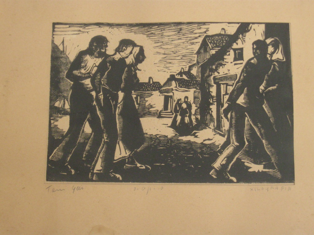 Figure: figure umane maschili; figure umane femminili. Paesaggio: vista di un paese