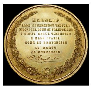 Si tratta di una medaglia commemorativa, realizzata in bronzo, che ricorda lo sbarco dei Mille a Marsala nel 1860