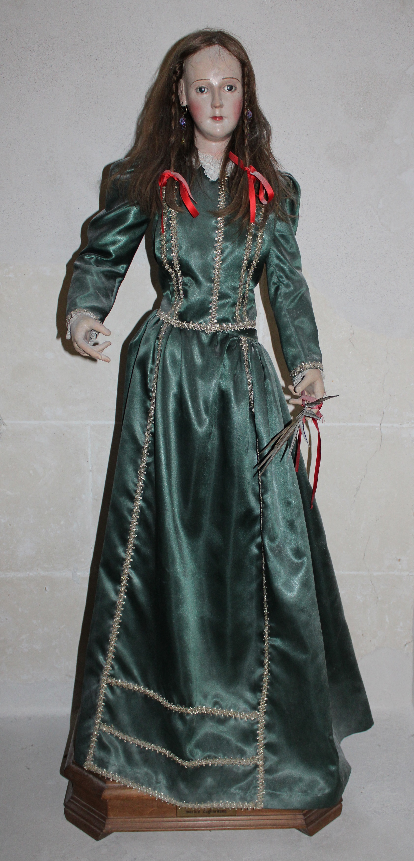 Statua su trespolo di Santa Faustina su base in legno, con trecce anteriori chiuse da fiocchi rossi e lungo abito verde arricchito da orli dorati. La mano sinistra tiene una foglia di palma