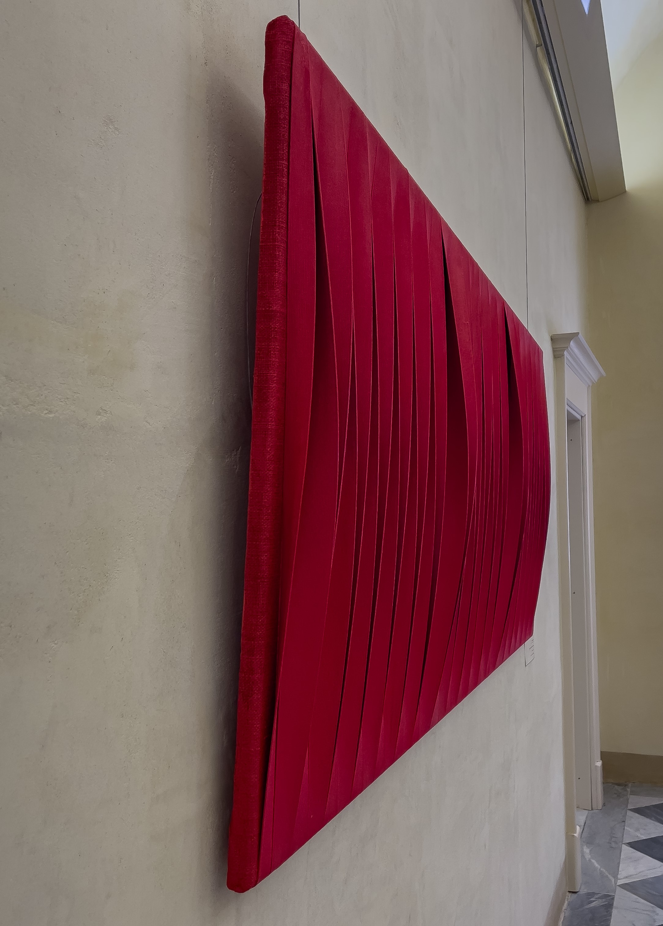Opera monocroma in rosso, costituita da una tela dipinta con dei nastri ritorti di tessuto applicati a formare delle estroflessioni